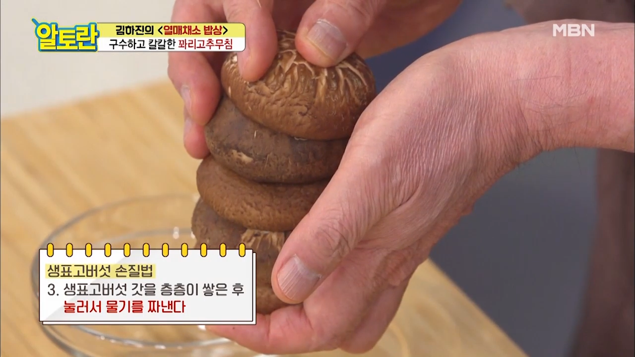 3. 생표고버섯갓을 층층이 쌓은 후 눌러서 물기를 짜냅니다.
