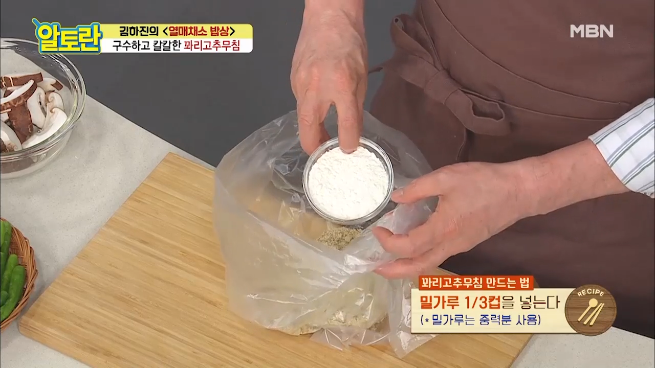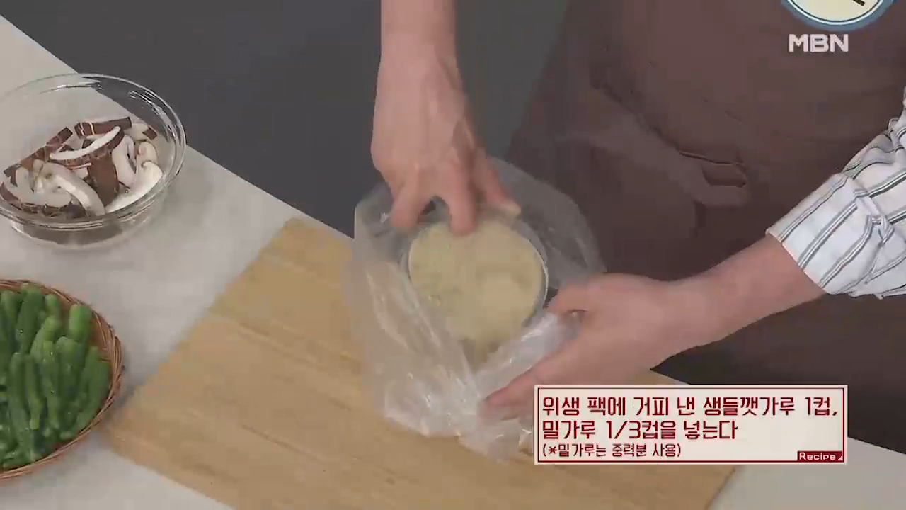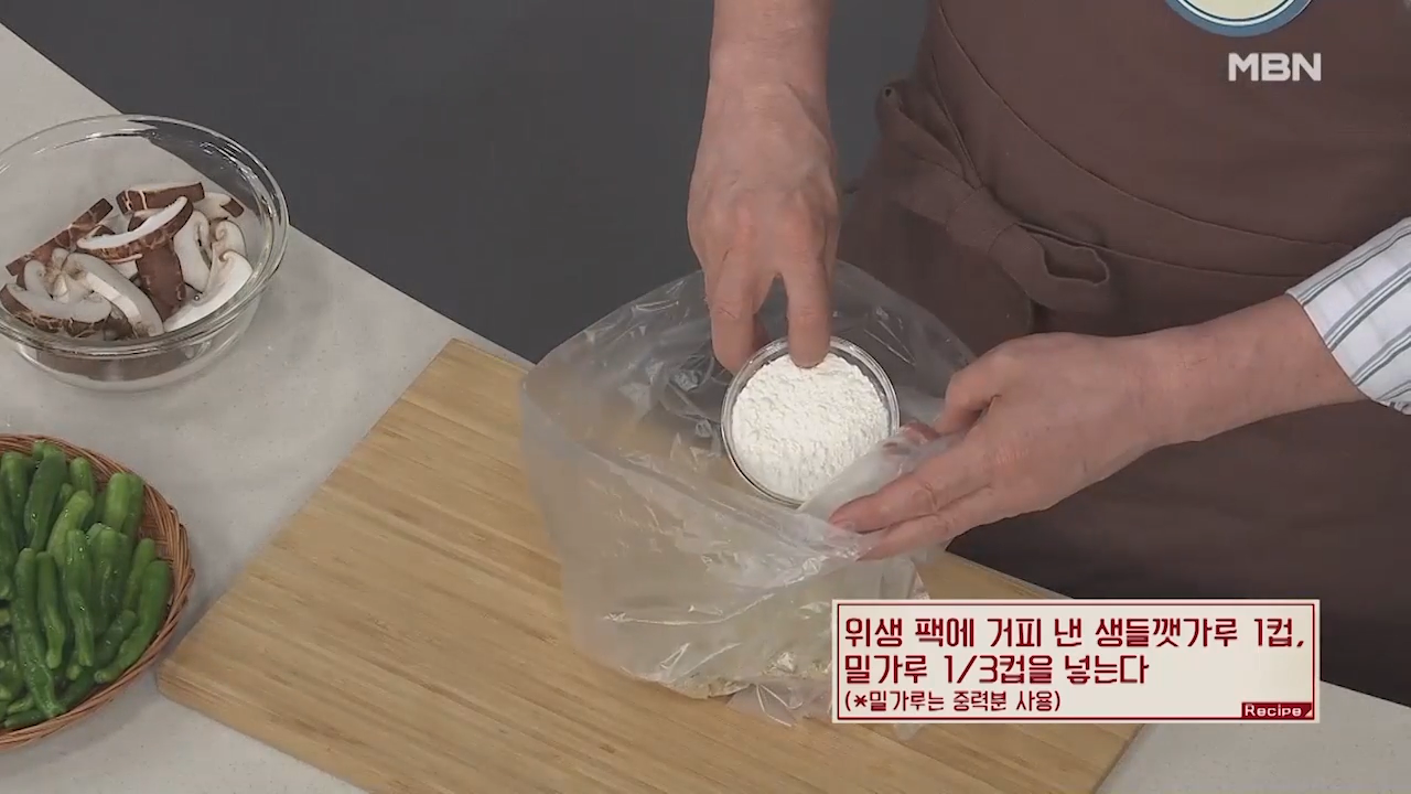 ▶남은 가루를 꽈리고추와 생표고버섯 위에 뿌려 줍니다.