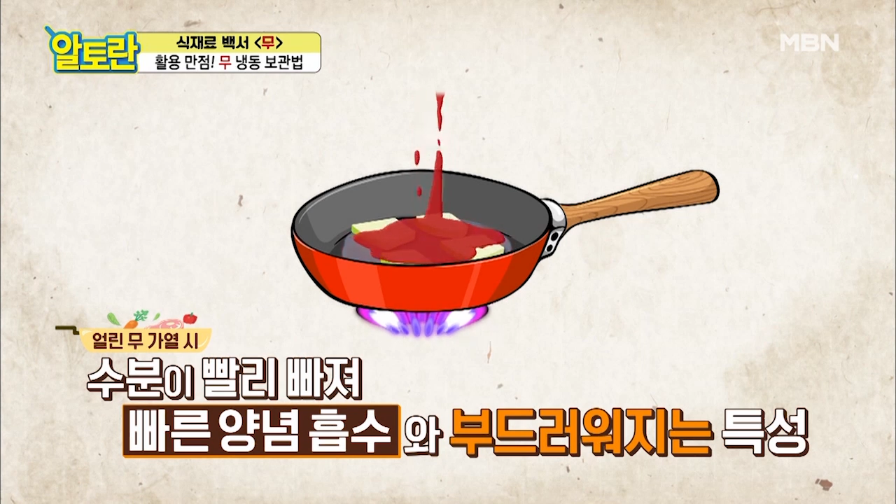 얼린 무를 가열하면 수분을 빨리 뱉어내고 빠르게 양념을 흡수해 부드러워지는 특성이 있습니다.