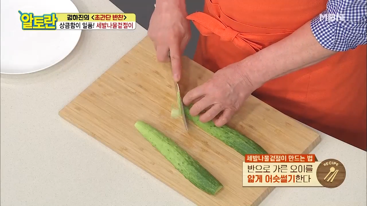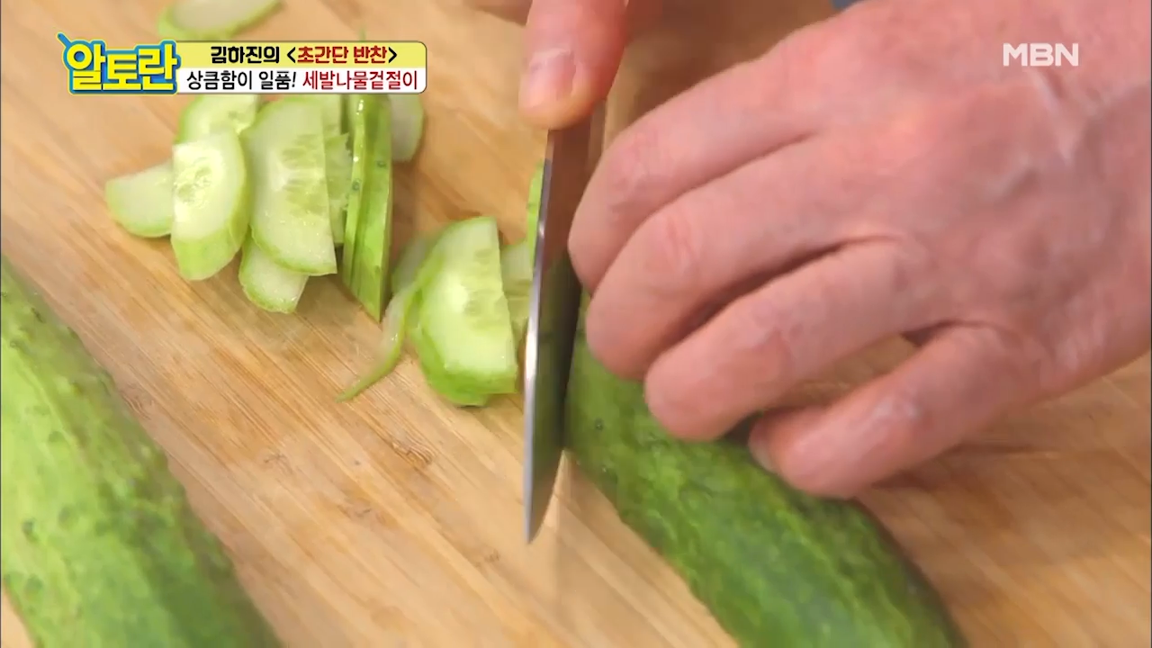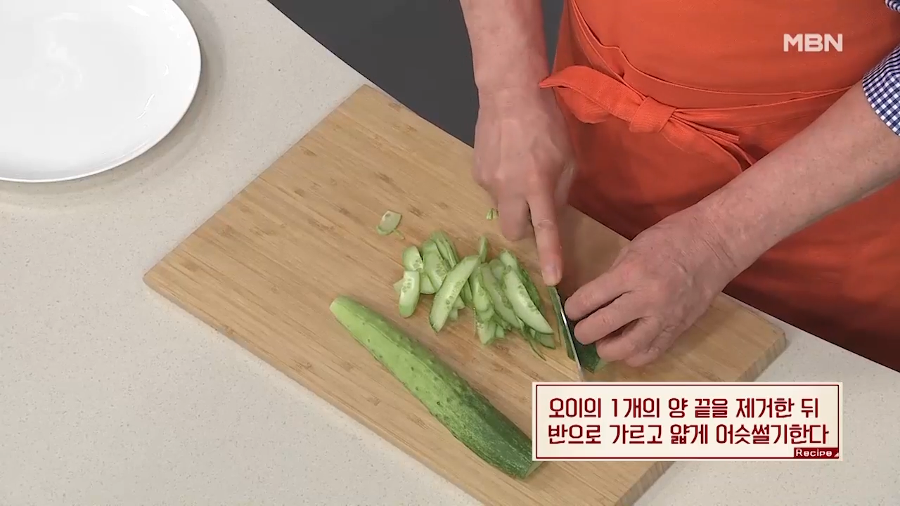 ▶반으로 가른 오이를 얇게 어슷썰기 해줍니다.