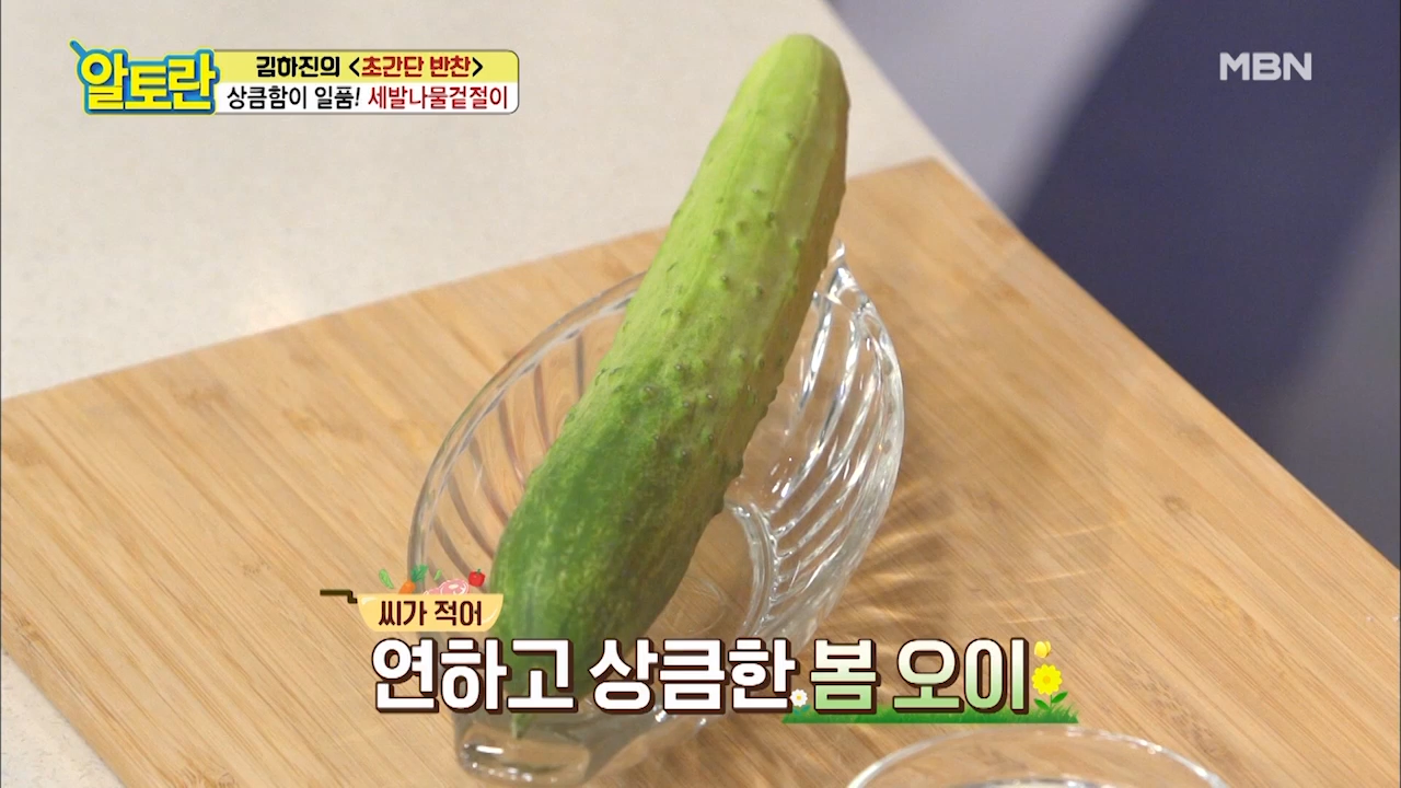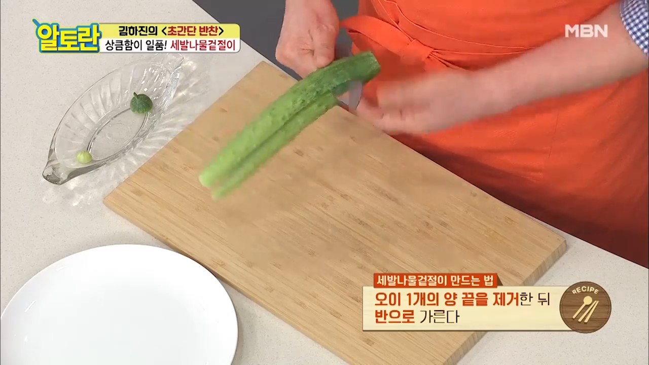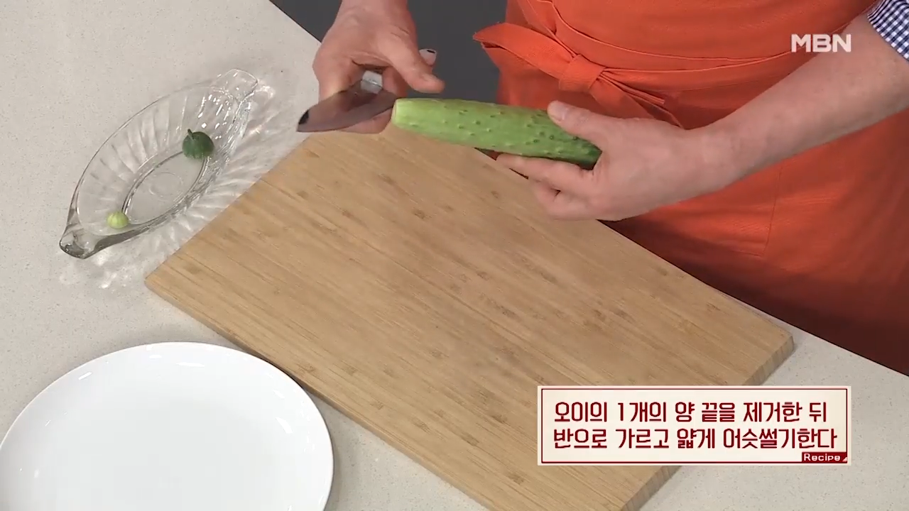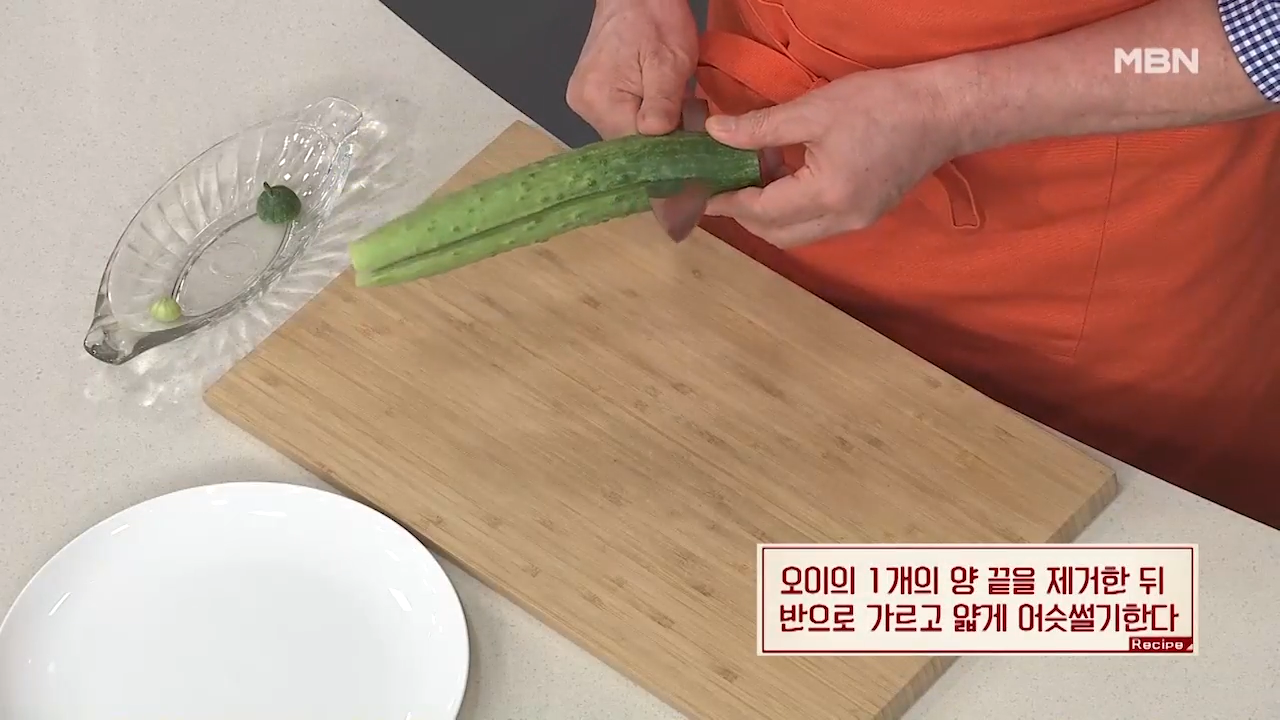 ▶오이 1개의 양 끝을 제거한 뒤 반으로 갈라줍니다.