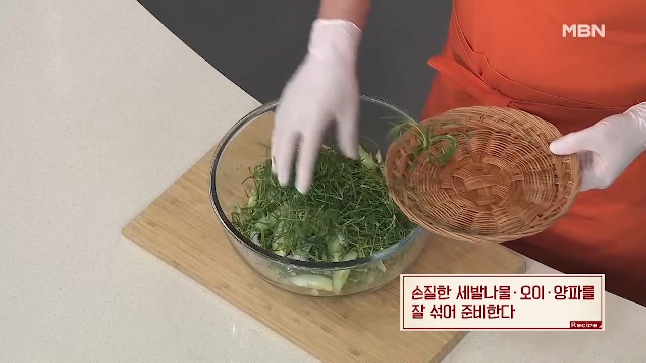 ▶손질한 세발나물, 오이, 양파를 잘 섞어 줍니다.