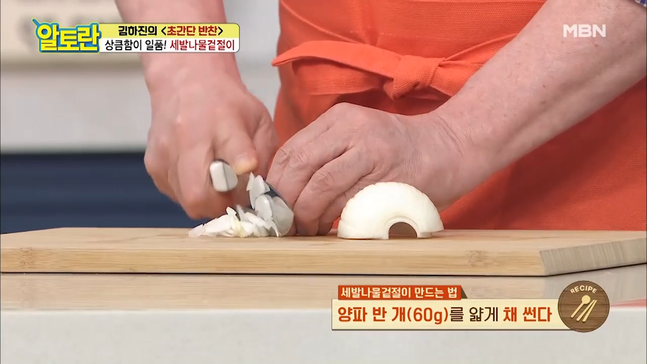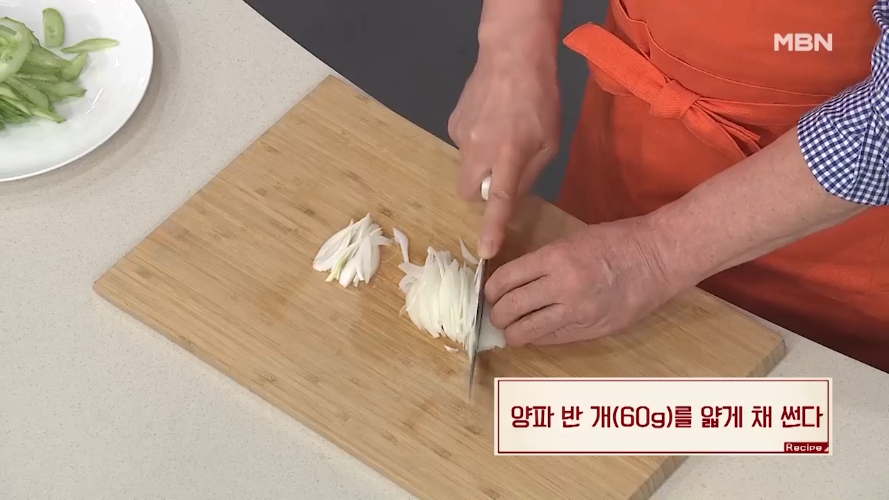 ▶양파 반 개(60g)를 얇게 채 썰어 줍니다.