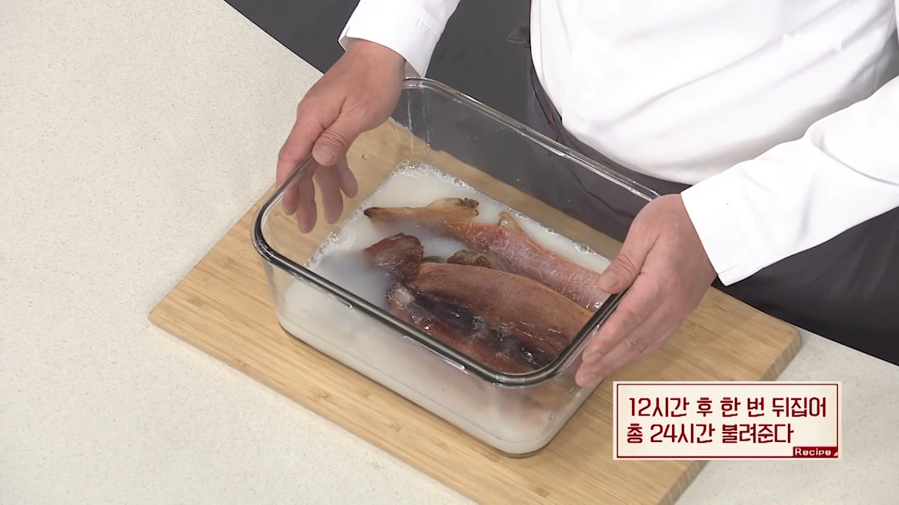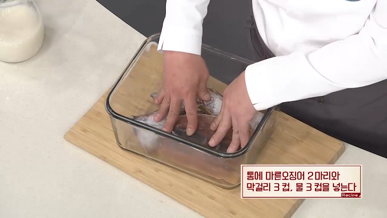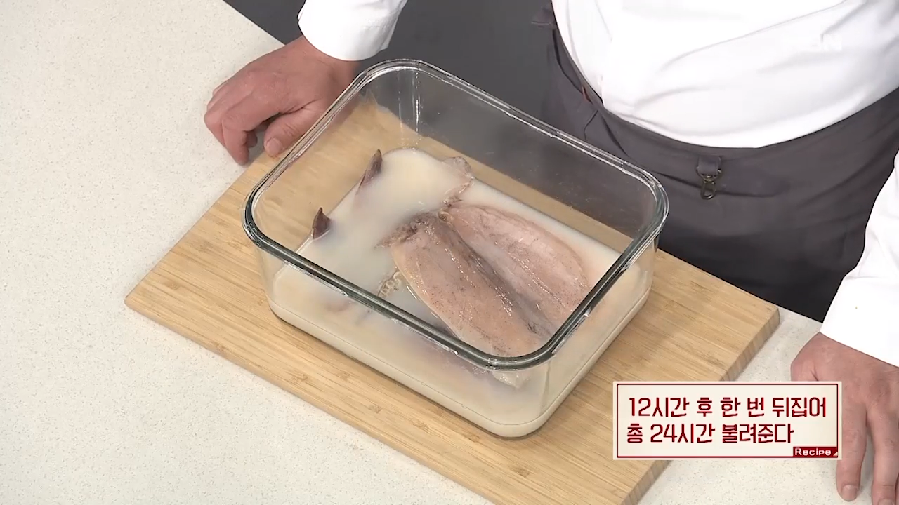 ▶마른오징어를 누를 필요 없이 12시간 후 뒤집어 불려 줍니다.