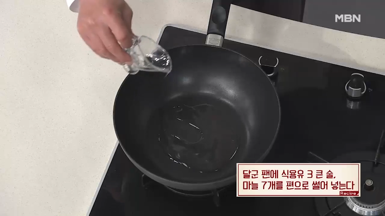 ▶센 불로 달군 팬에 식용유 3 큰 술을 넣어 줍니다.