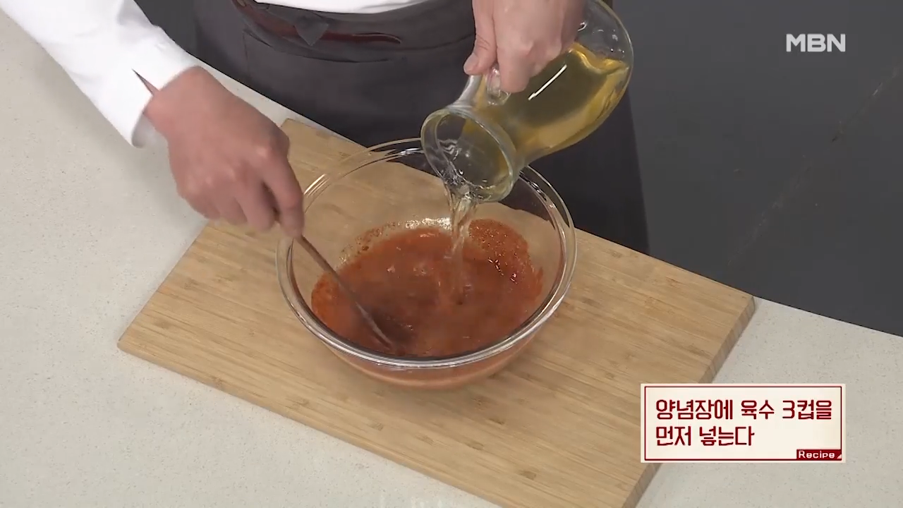 ▶양념장에 육수 3컵을 넣어 줍니다.