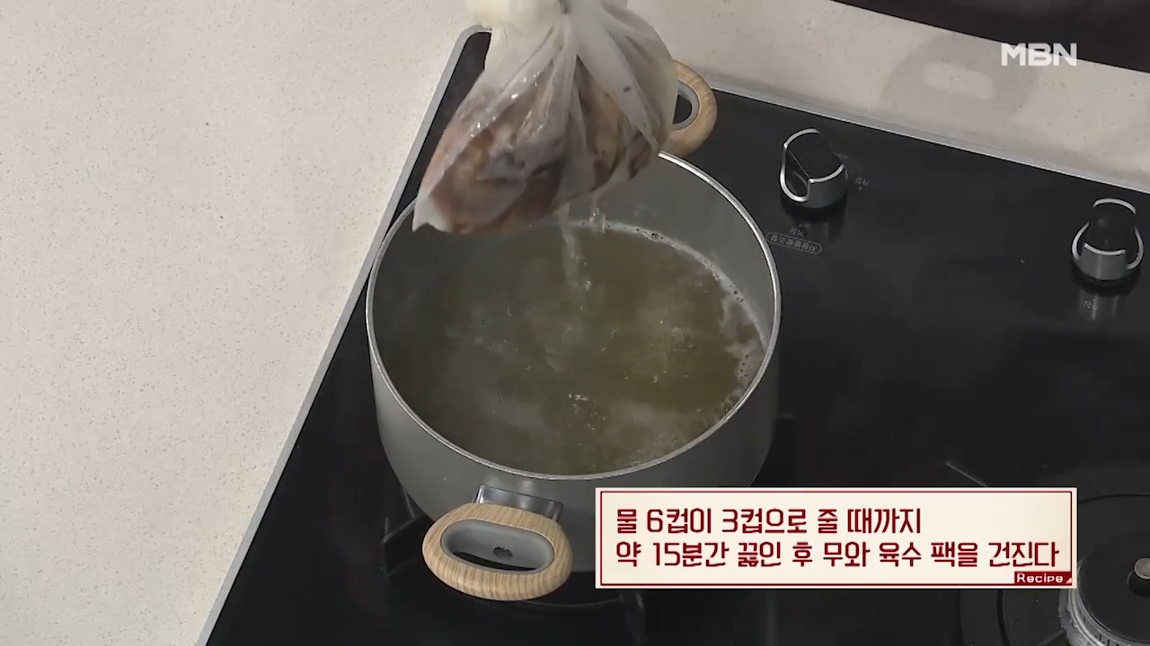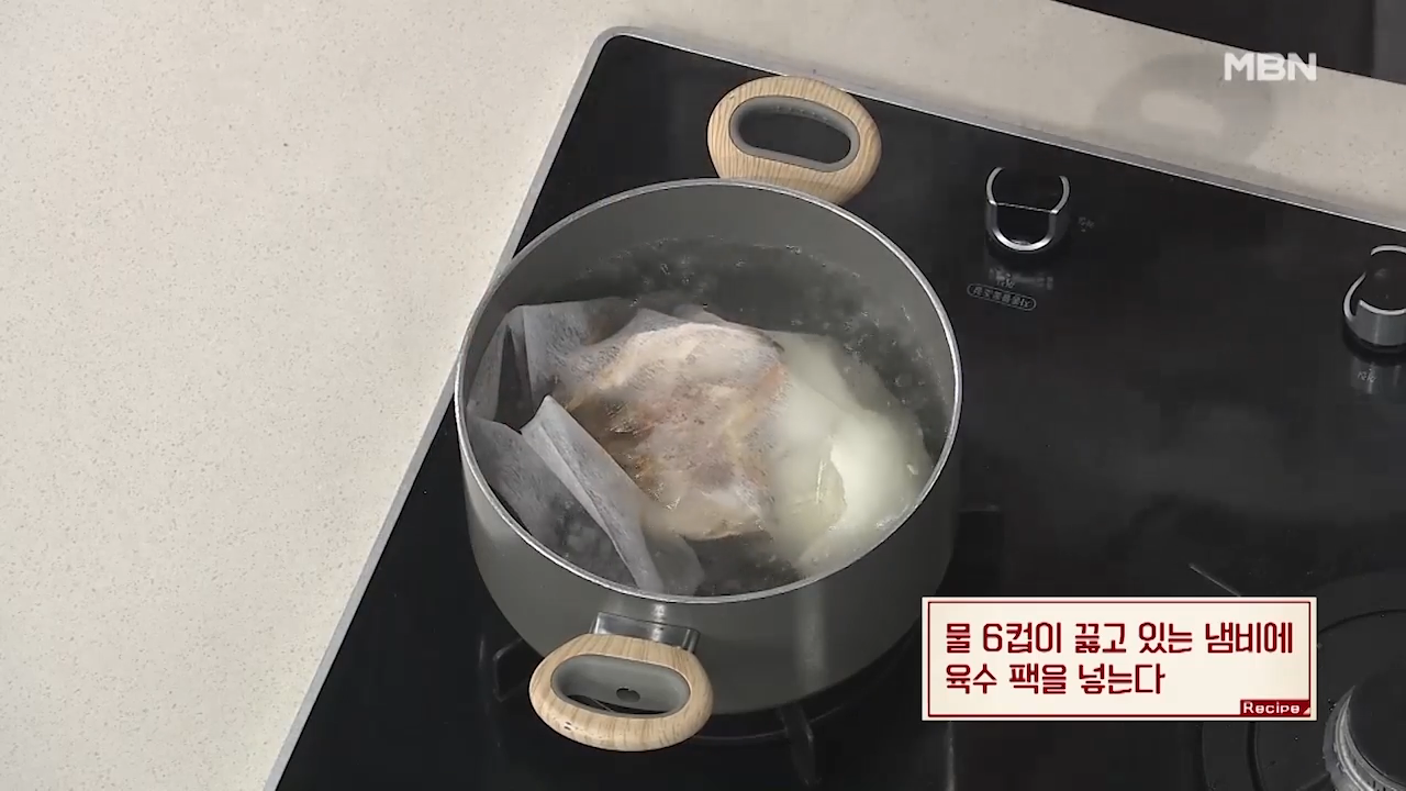 ▶물 6컵이 끓고 있는 냄비에 육수 팩을 넣어 줍니다.