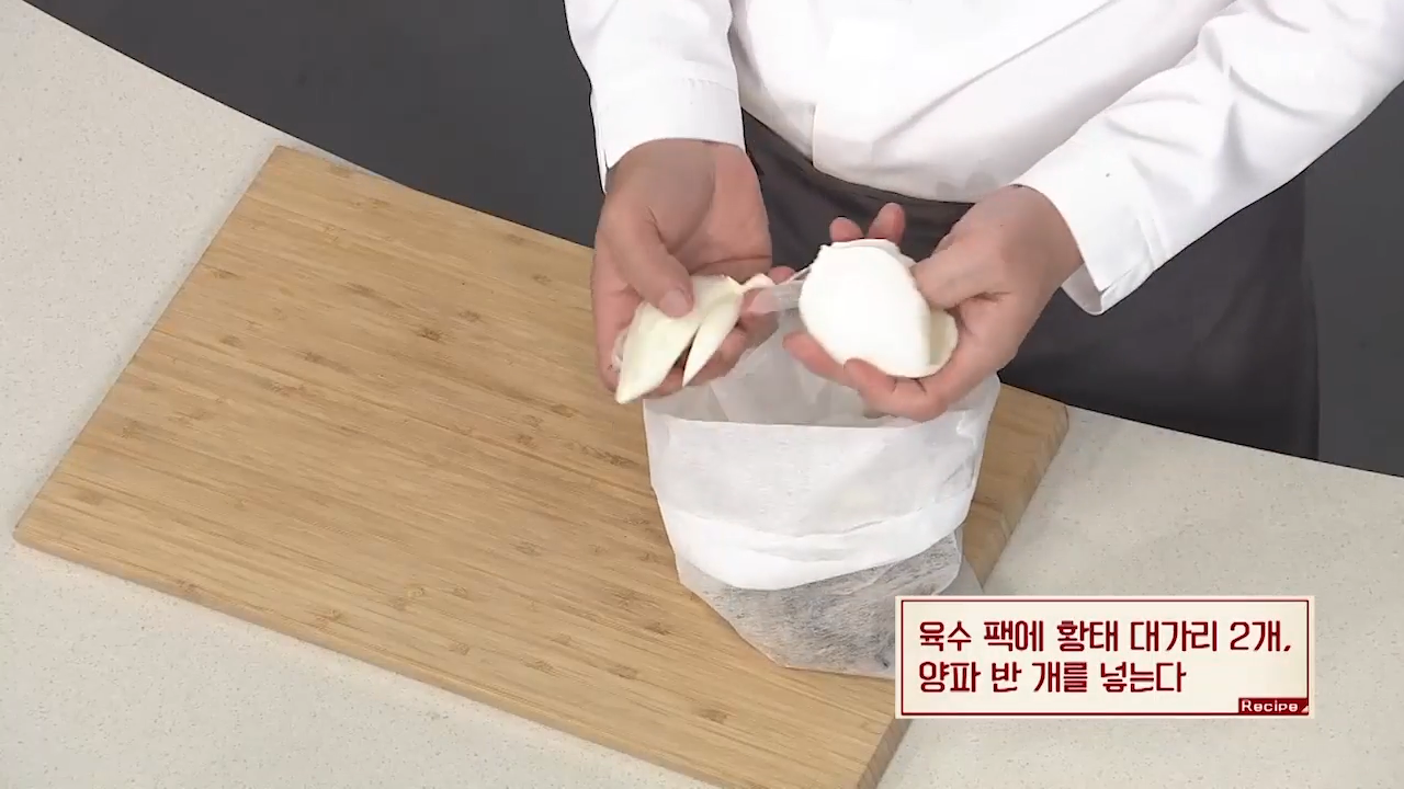 ▶육수 팩에 잘라놓은 황태 대가리 2개를 넣어줍니다.