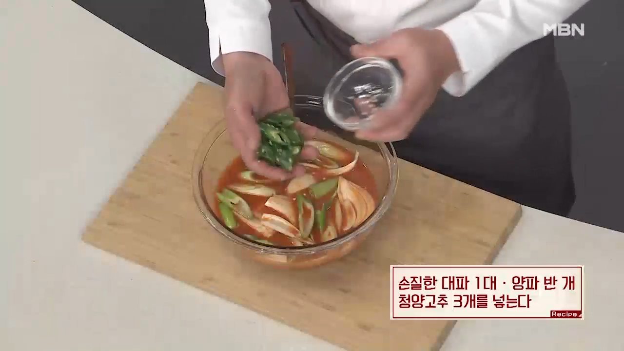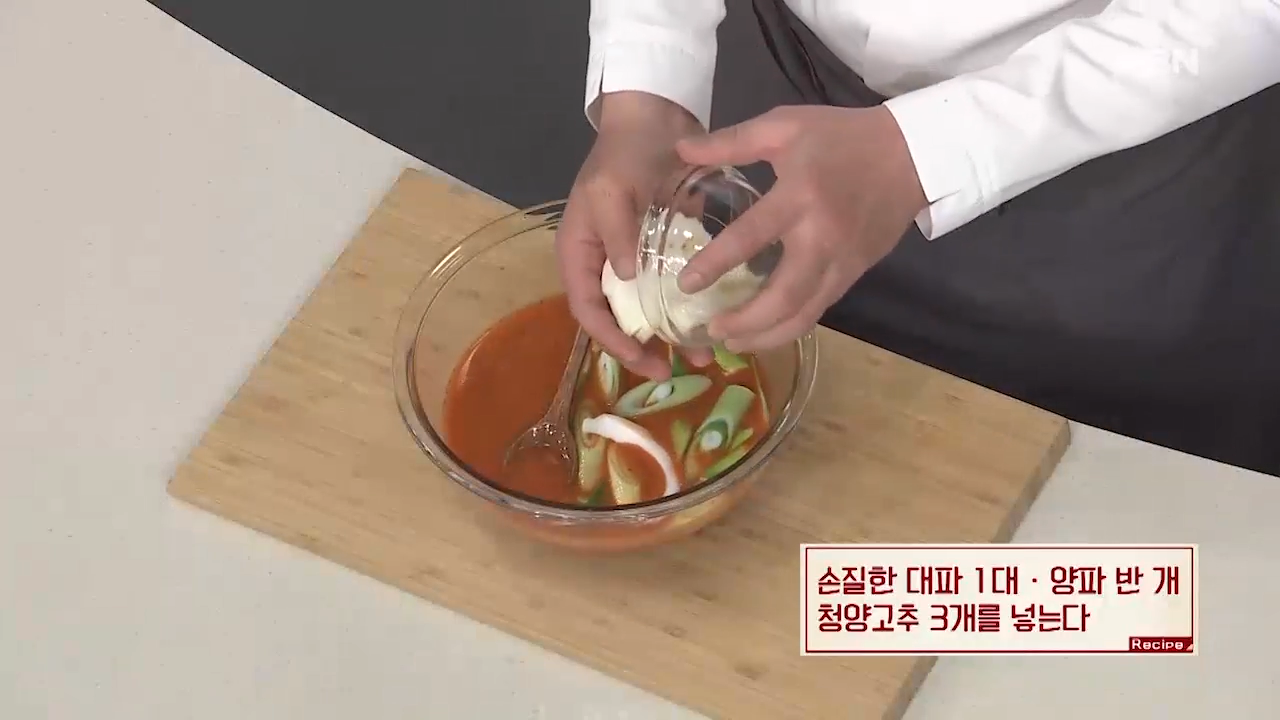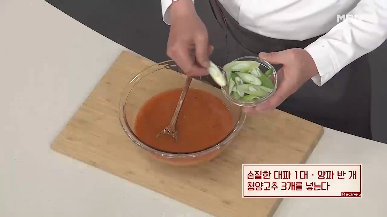▶어슷썰기 한 청양고추 3개를 넣어 줍니다.