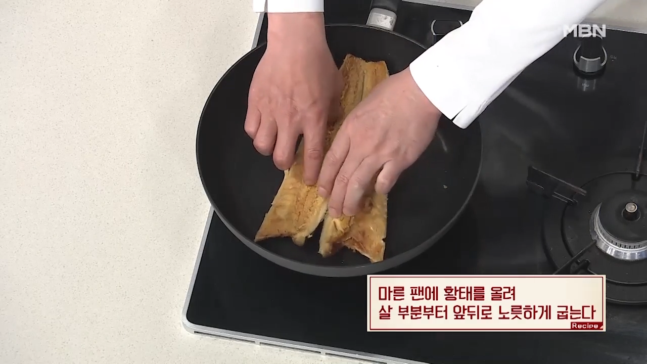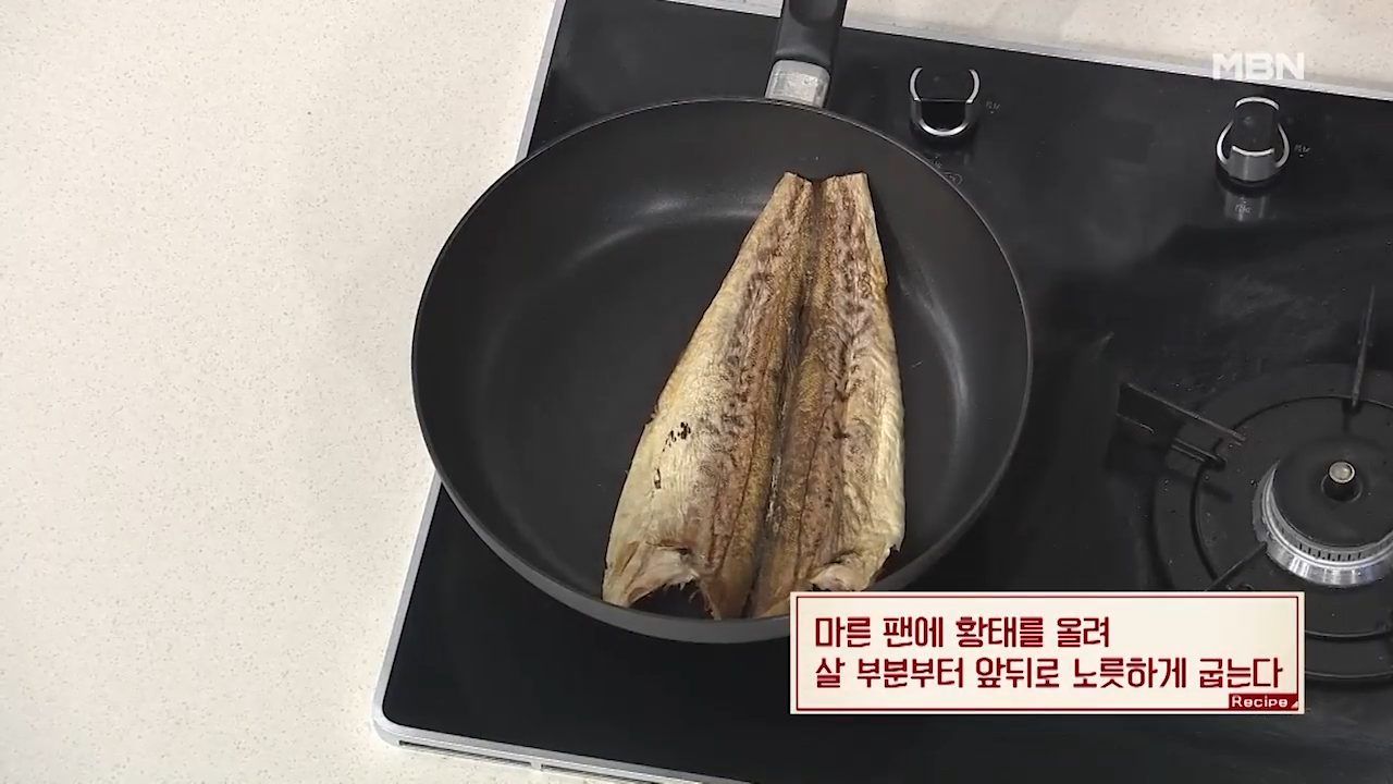 ▶센 불에 팬을 올리고 황태의 살 부분 먼저 구워 줍니다. 껍질부터 구우면 황태 살이 말리게 됩니다.