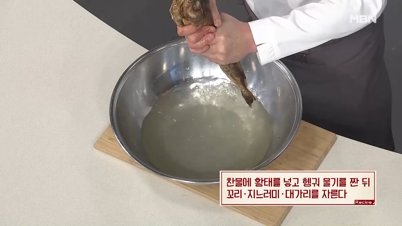 ▶황태를 물에 헹구면 부스러기가 제거되고 잡내도 제거됩니다.
