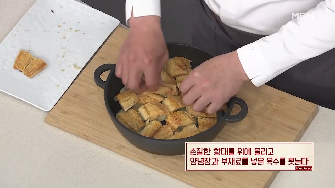 ▶손질한 황태를 무와 감자 위에 올리고 양념장과 부재료를 넣은 육수를 부어 줍니다.
