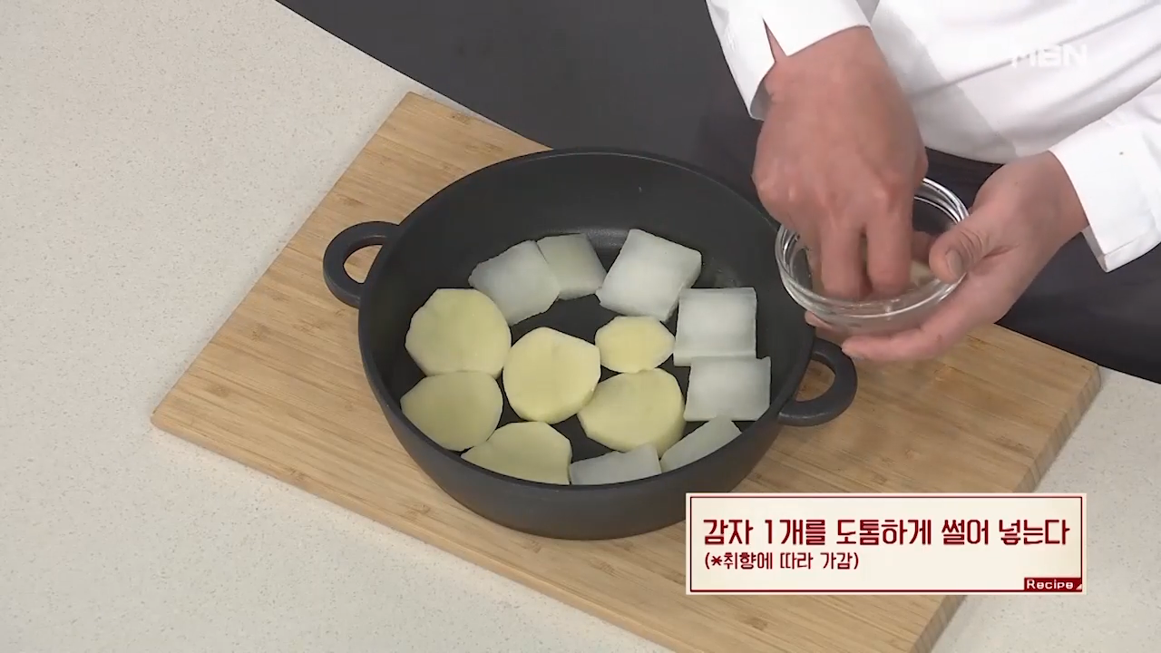 ▶감자 1개를 도톰하게 썰어 깔아줍니다. 감자는 취향에 따라 가감해줍니다.