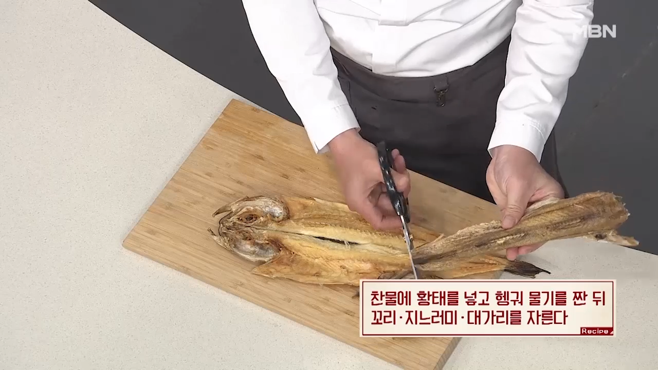 ※ 황태 대가리 제거 시 일자로 자르면 황태 살이 같이 잘리게 되므로 V자 모양으로 잘라 대가리만 잘라냅니다.