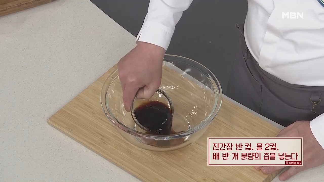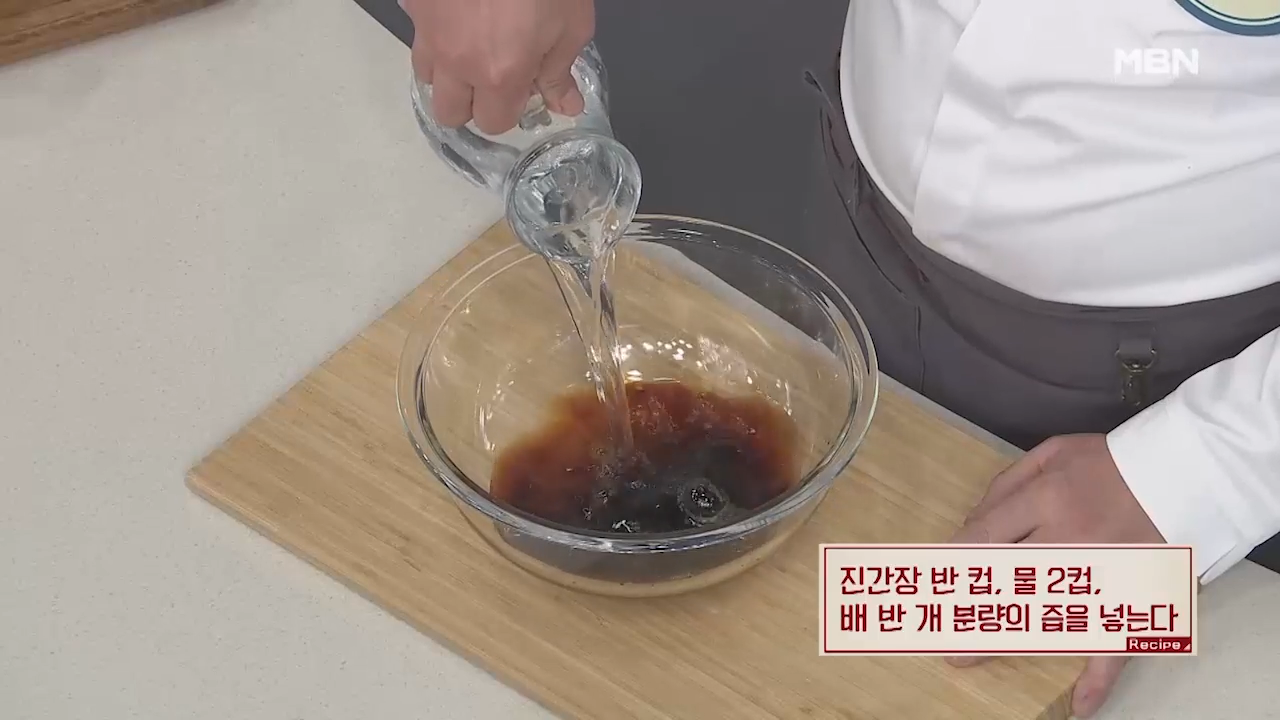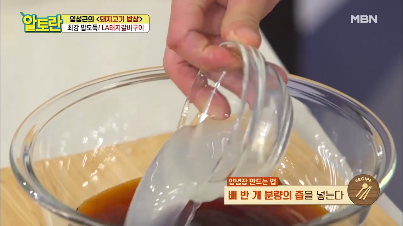 ▶배 반 개 분량의 즙을 넣어 줍니다.