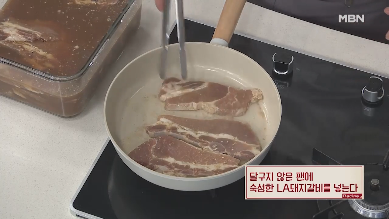 ▶달구지 않은 팬에 숙성한 LA돼지갈비를 넣어 줍니다.