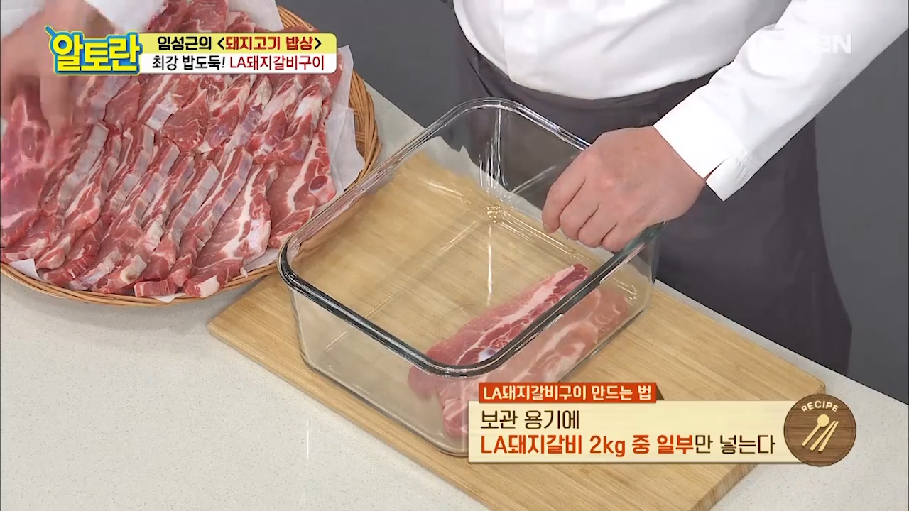 ▶보관용기에 LA돼지갈비 2kg 중 일부만 넣어 줍니다.