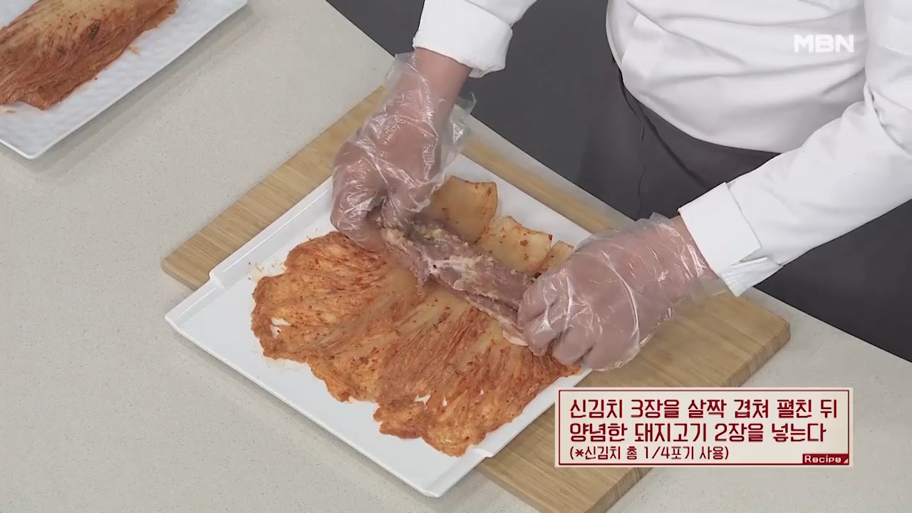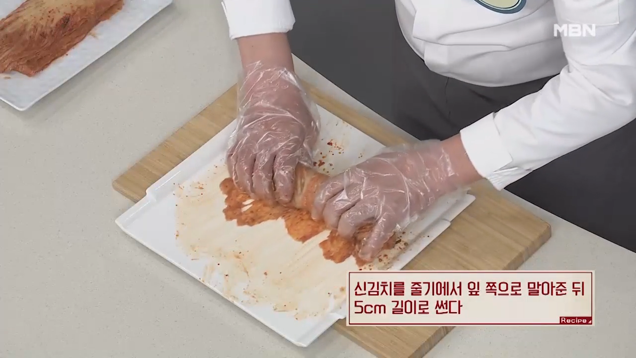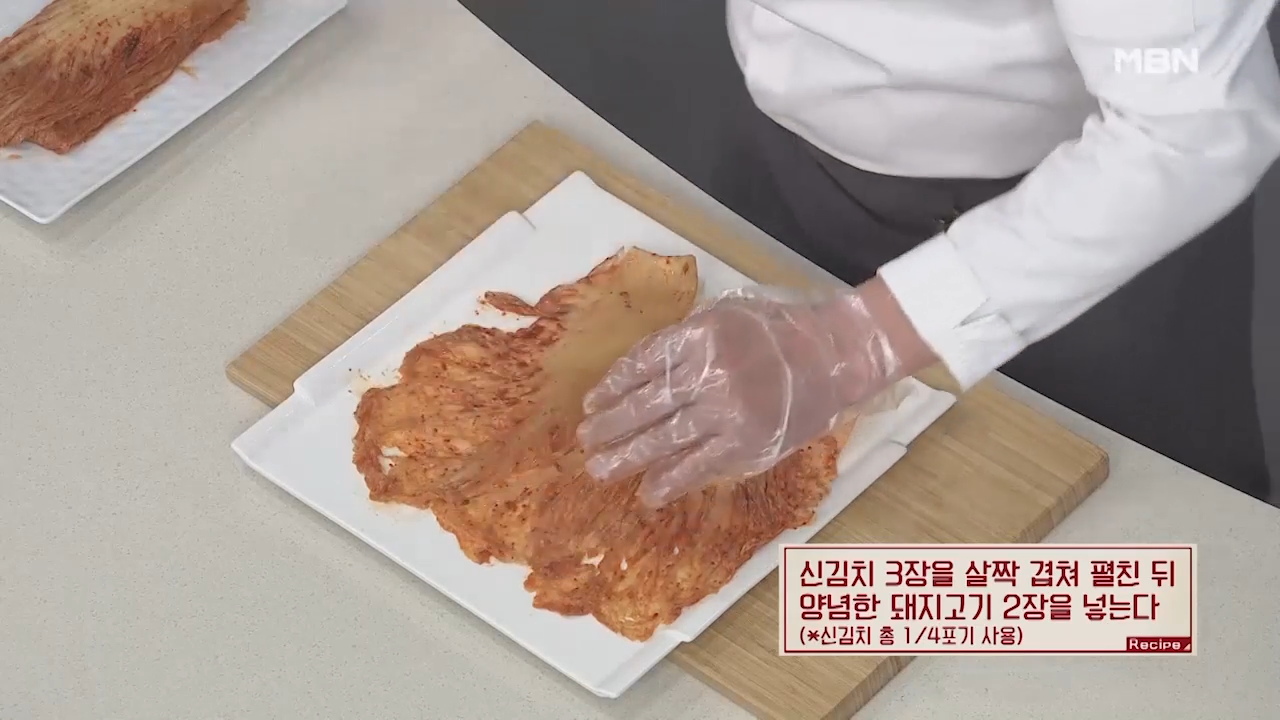 ▶신김치 3장을 살짝 겹쳐 펼쳐줍니다.