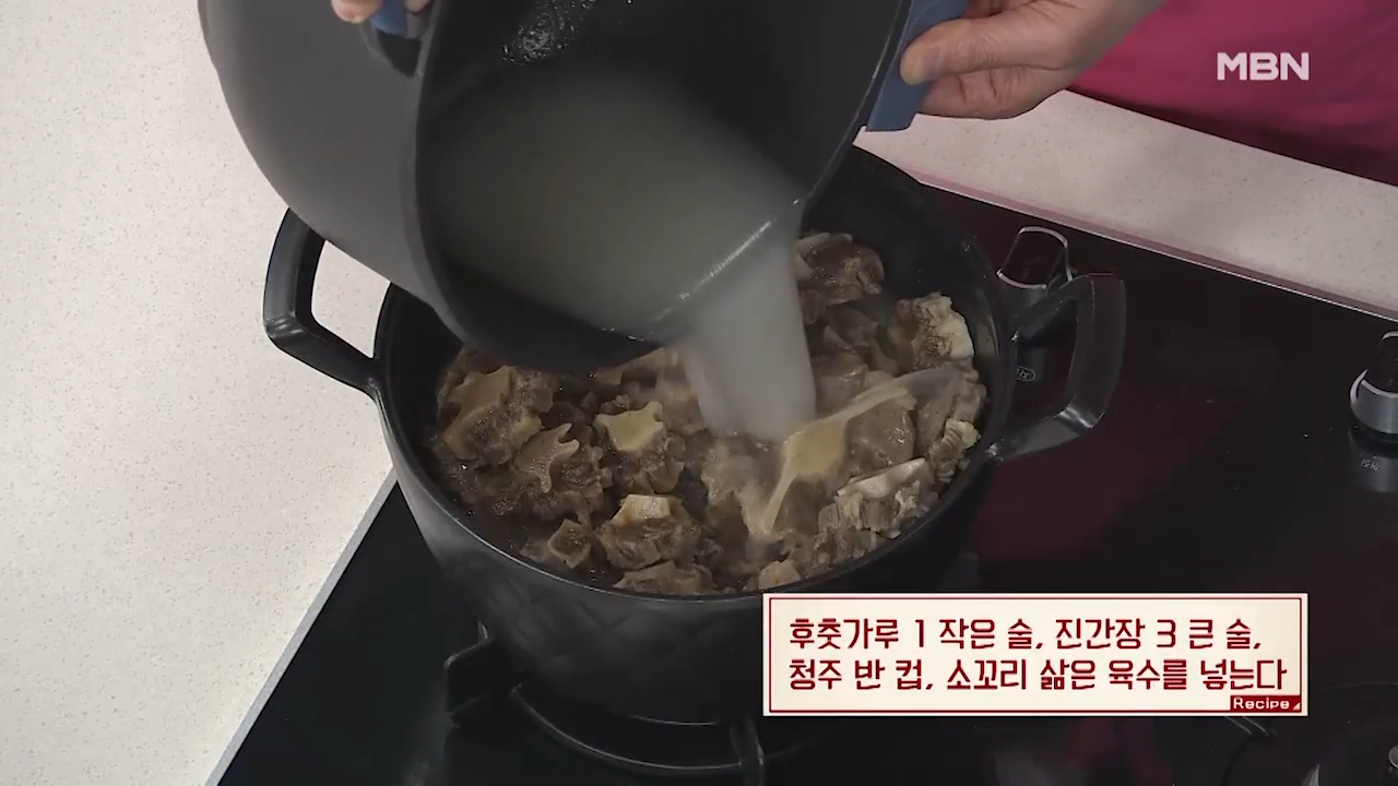 ▶소꼬리를 삶은 육수를 넣어줍니다.