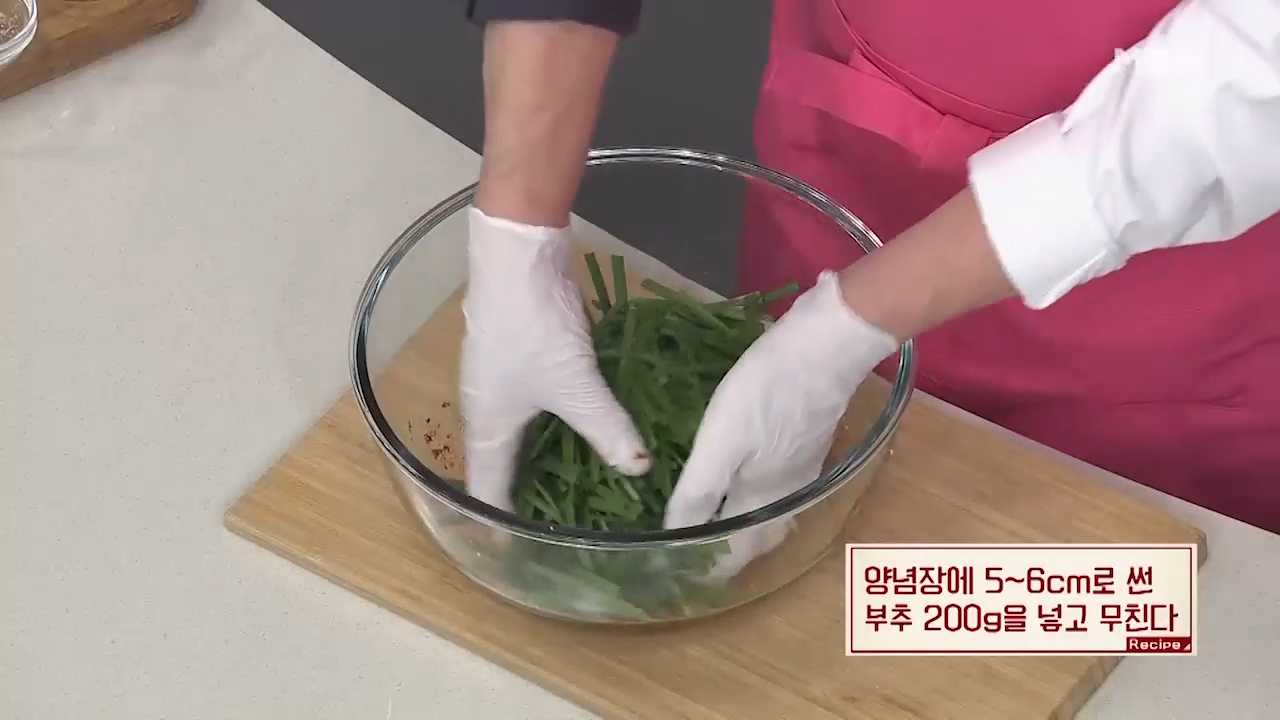 ▶손질한 부추 200g을 넣고 양념에 부추를 무쳐줍니다.