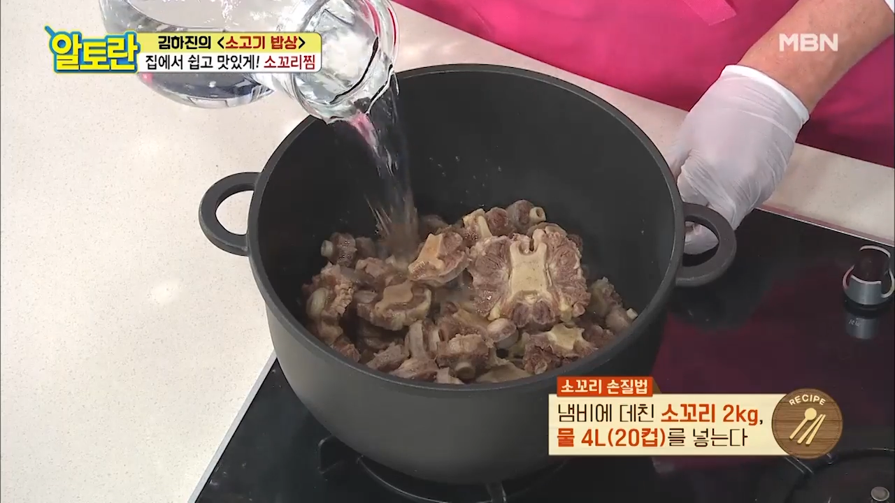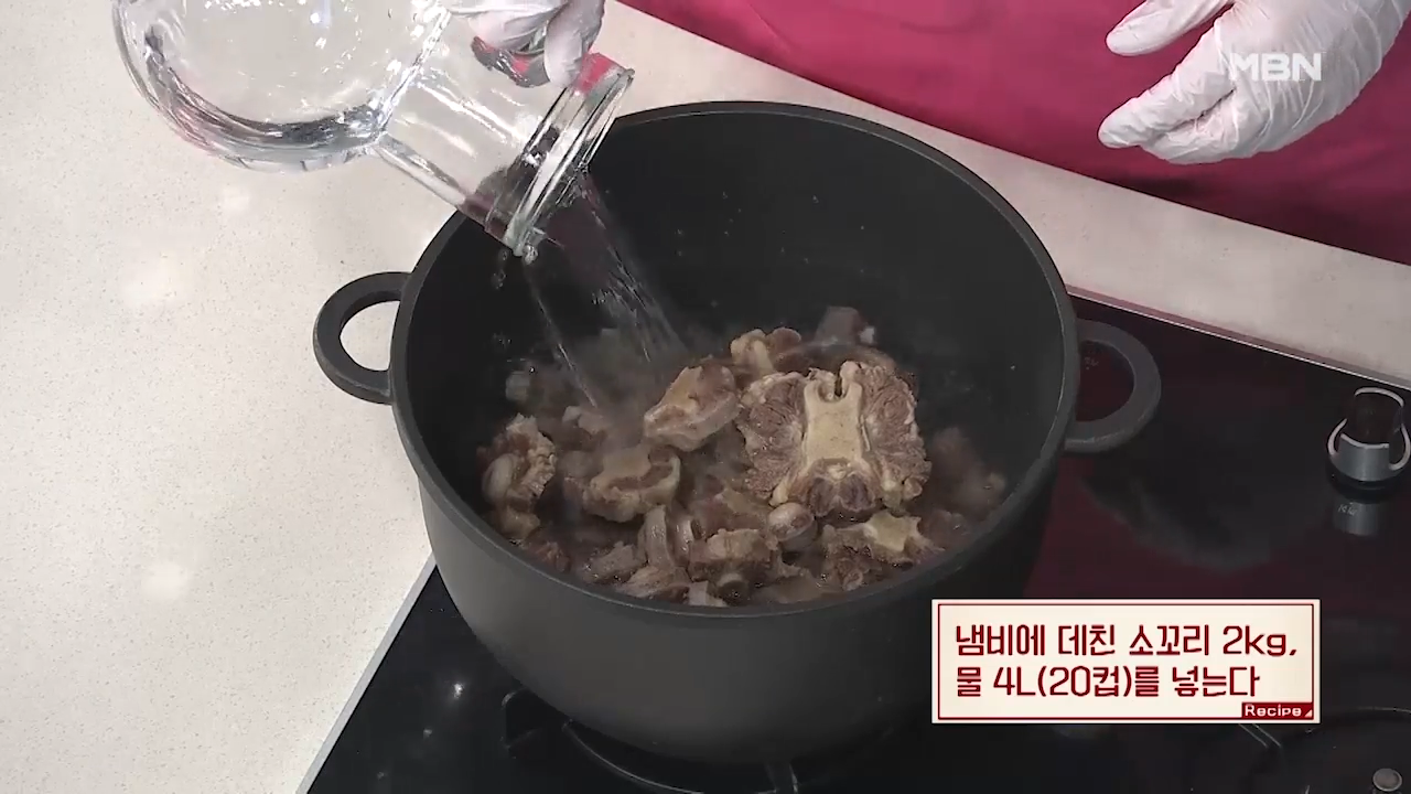▶냄비에 데친 소꼬리 2kg, 물 4L(20컵)를 넣어줍니다.