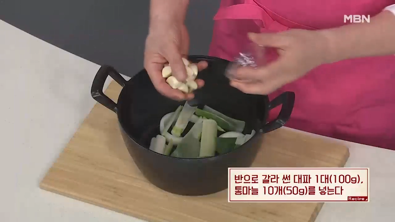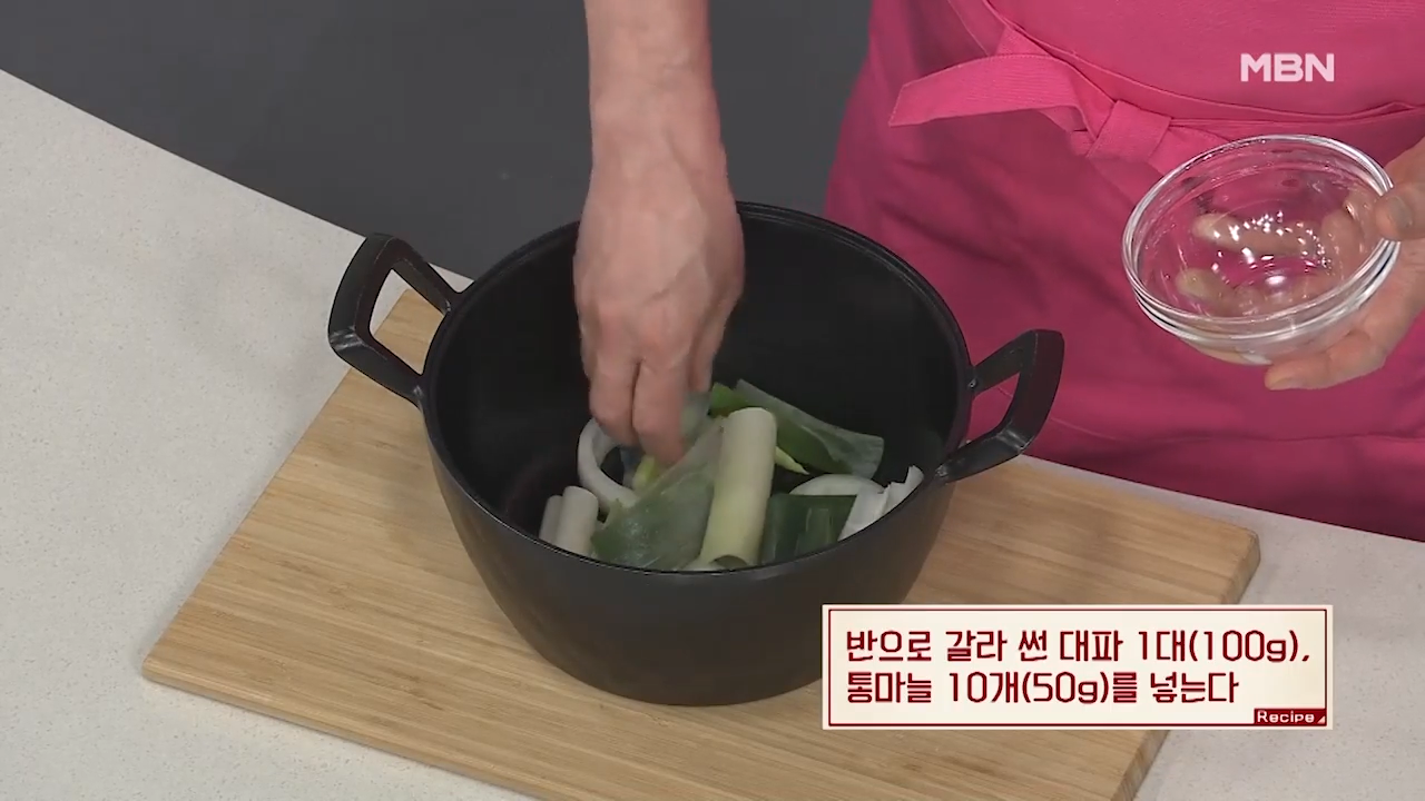 ▶반으로 갈라 썬 대파 1대(100g)를 넣어 줍니다.