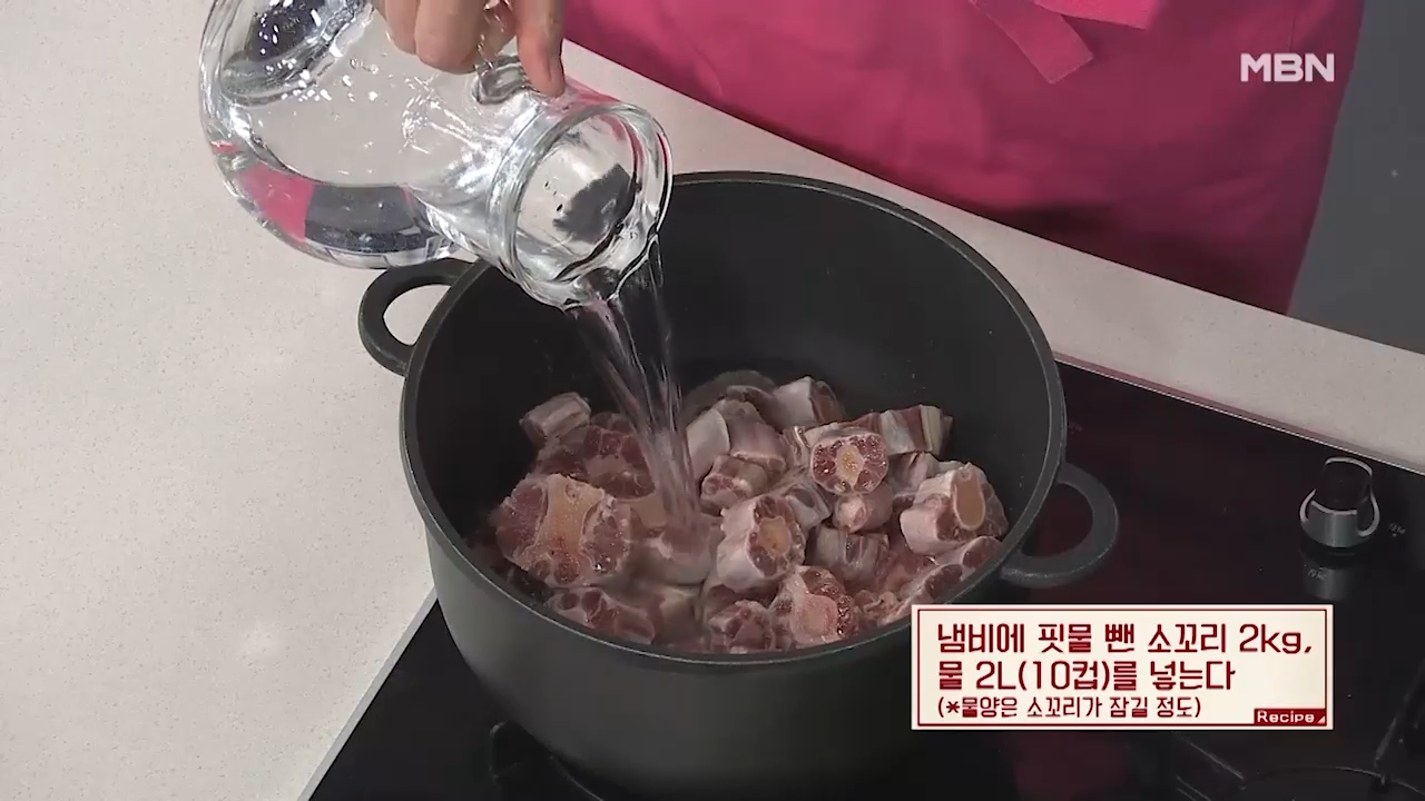 ▶냄비에 소꼬리 2kg, 냉수 2L(10 컵)를 넣어 줍니다. 물의 양은 소꼬리가 잠길 정도로 넣어줍니다.
