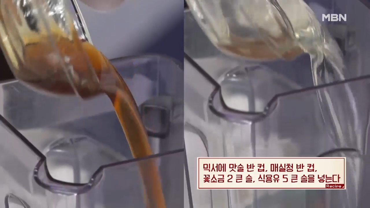 ▶윤기를 더하고 잡내를 잡아줄 맛술 반 컵을 믹서에 넣어줍니다.