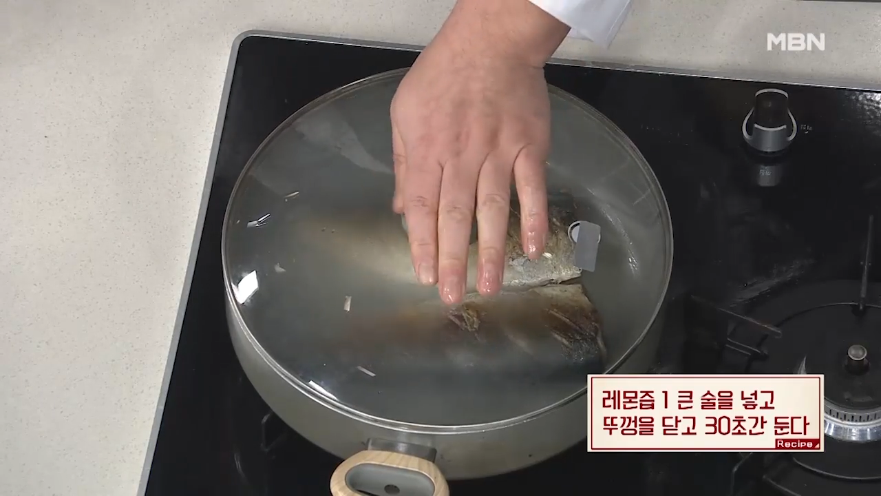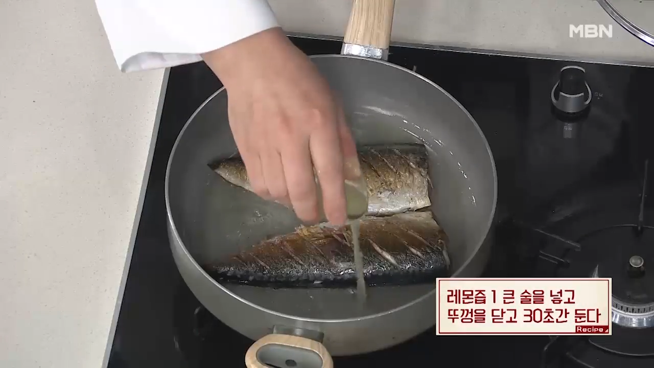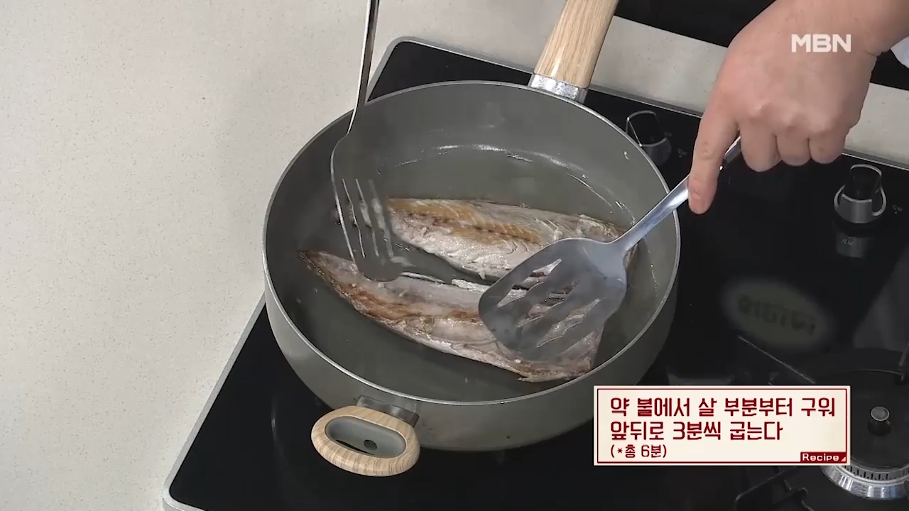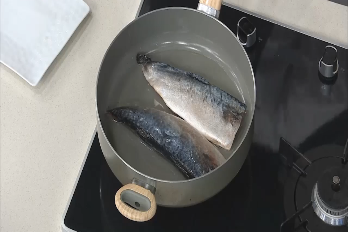 ▶3분가량이 지나면 고등어를 뒤집어 줍니다.