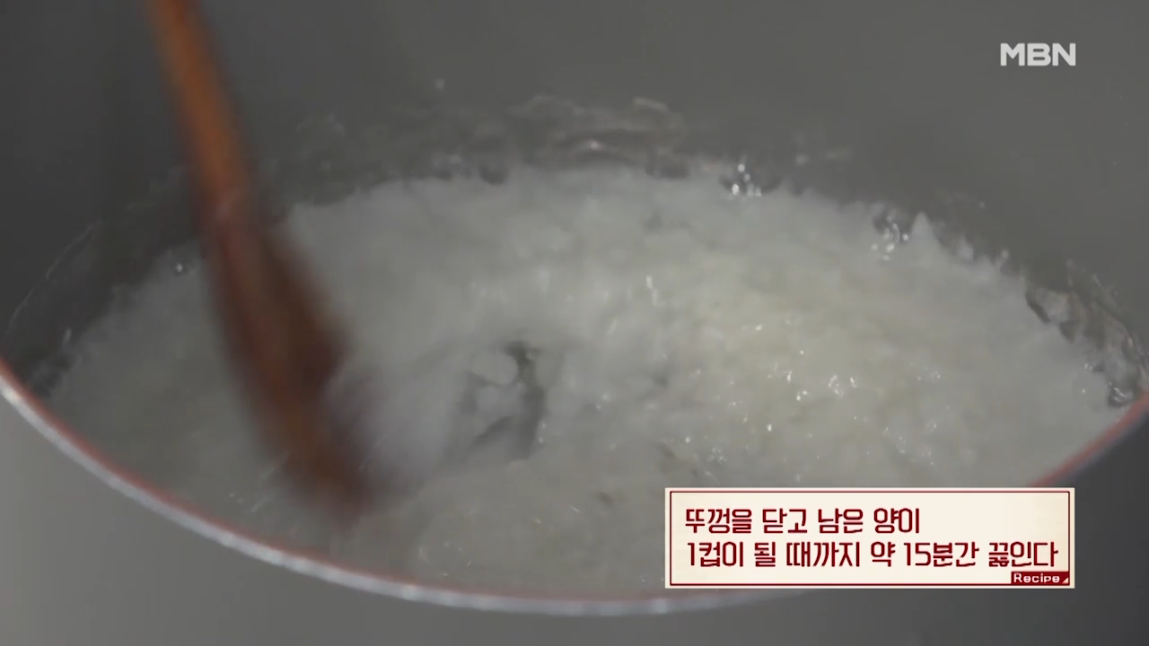 ▶끓인 후 물의 양이 1컵 정도 남게 되면 찹쌀이 거의 묽은 죽이 됩니다.