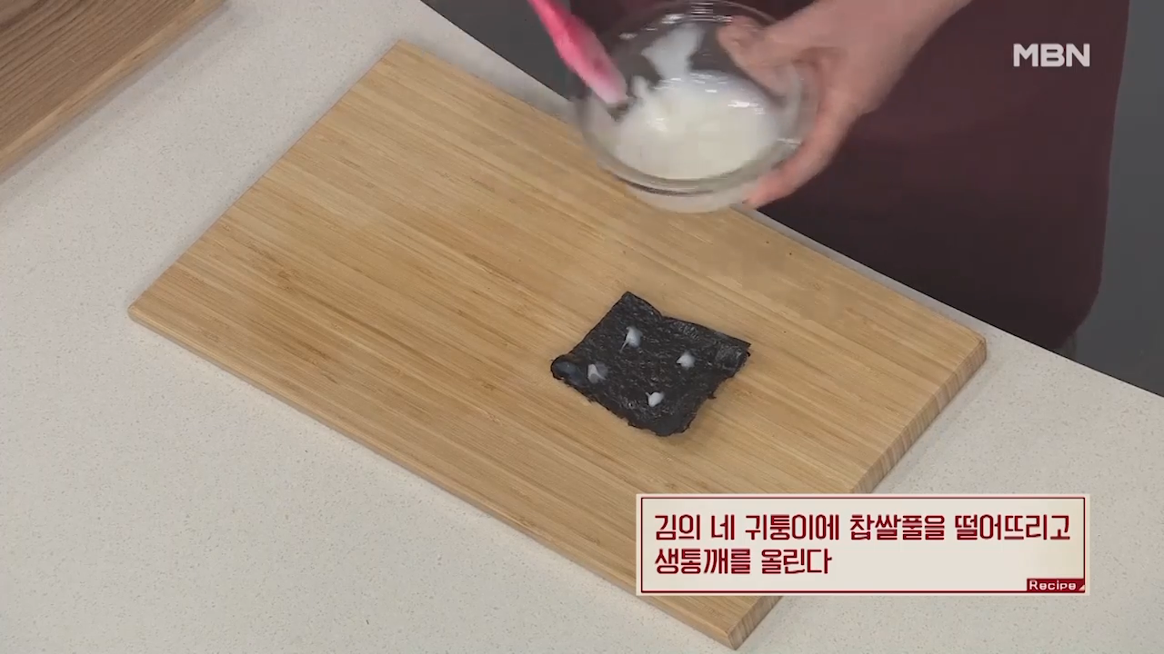 ▶김의 네 귀퉁이에 찹쌀풀을 조금씩 떨어뜨려 줍니다.