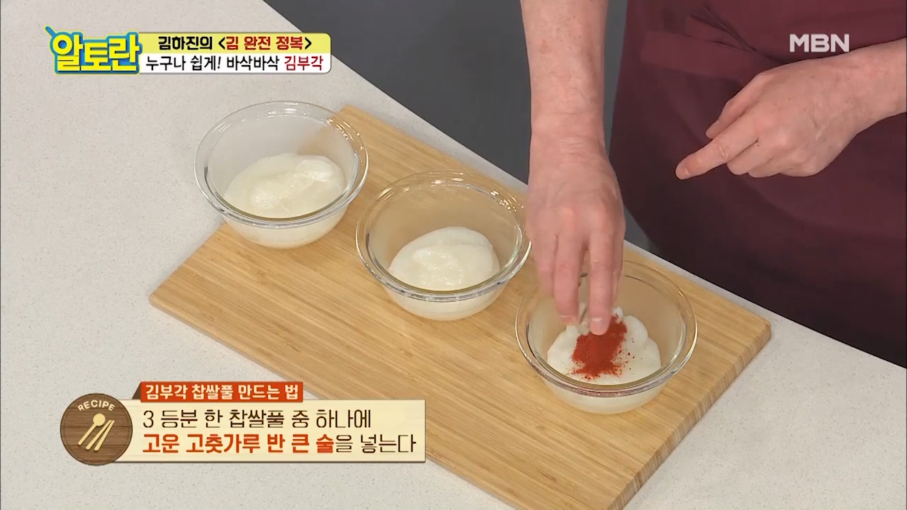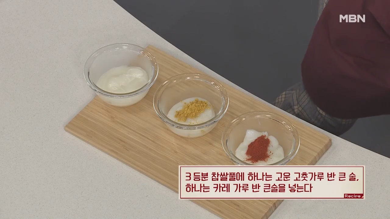 ▶3 등분 한 찹쌀풀 중 하나에 고운 고춧가루 반 큰 술을 넣어줍니다.