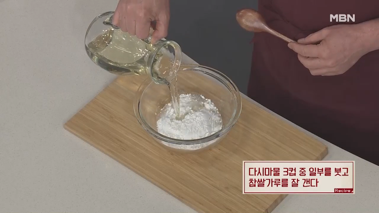 ▶다시마물 3컵 중 일부를 붓고 찹쌀가루를 잘게 개어줍니다.