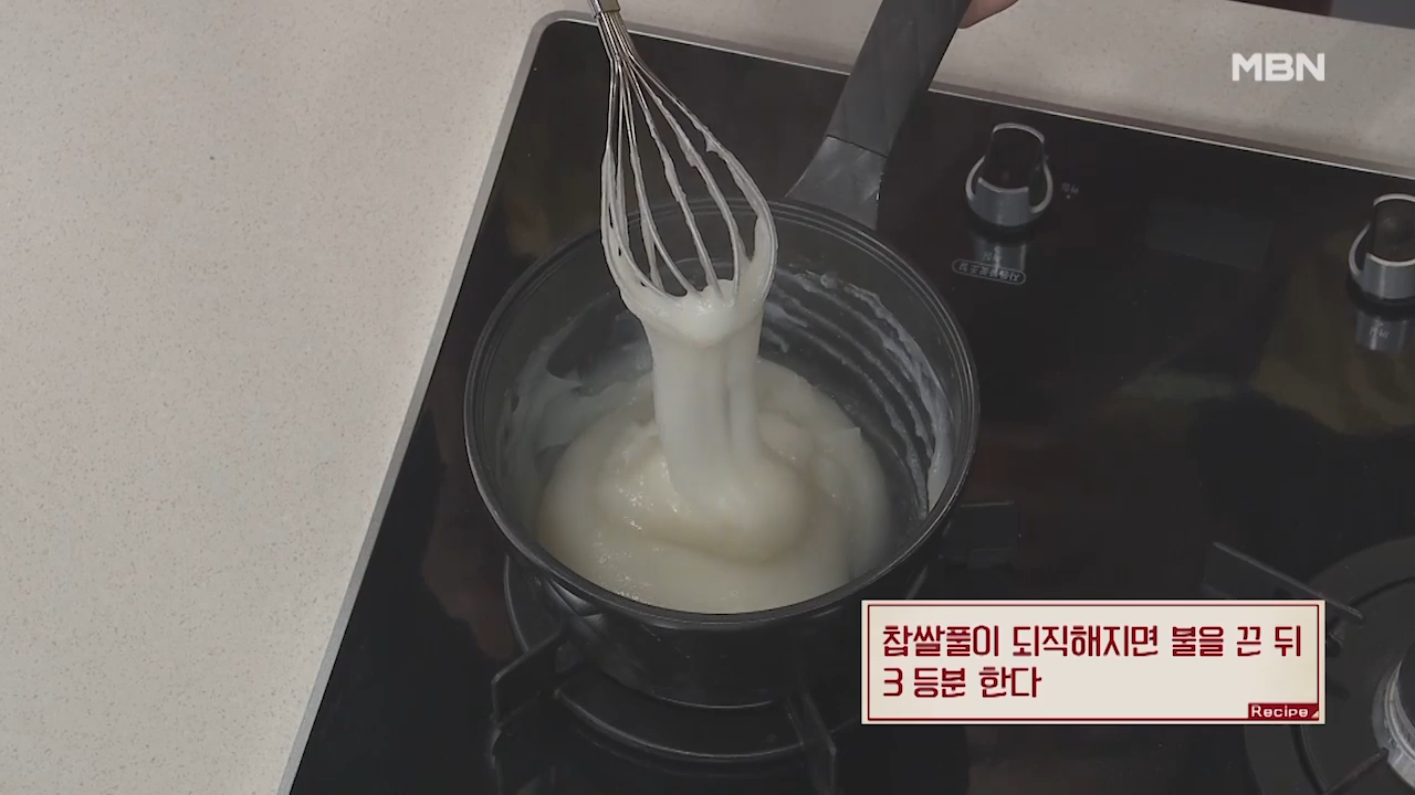 ▶찹쌀풀이 되직해지면 불을 꺼줍니다.