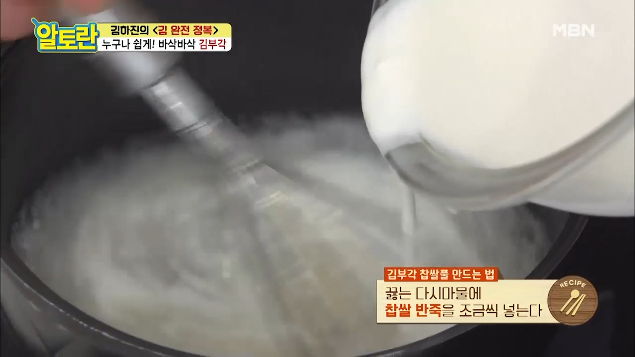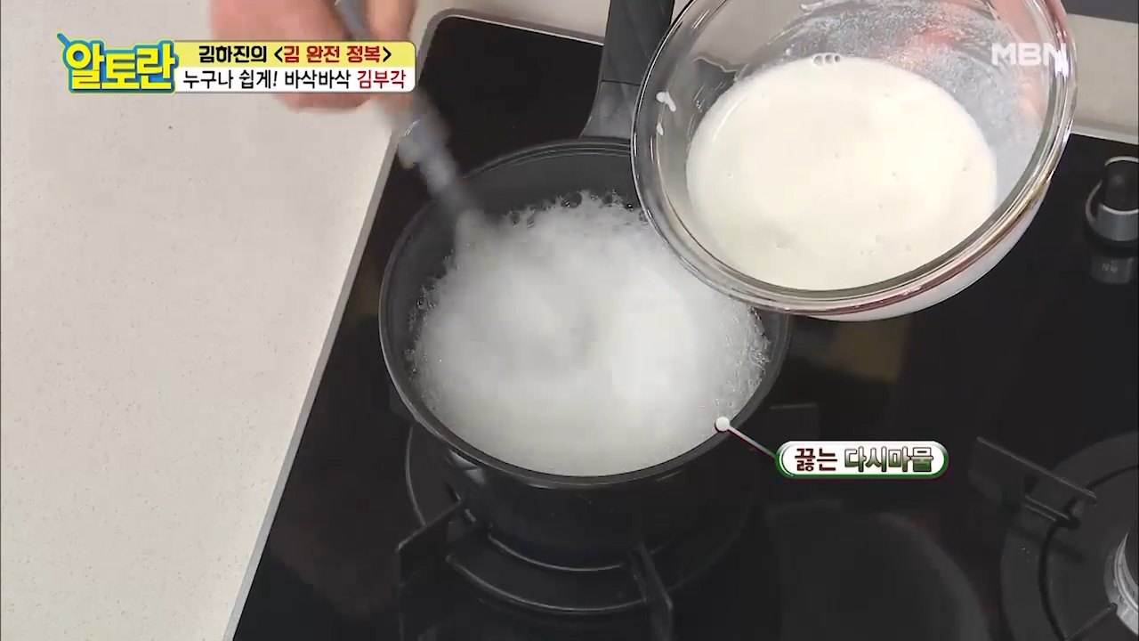 ※다시마물을 넣는 이유는 찹쌀풀을 쑬 때 다시마물을 사용하면 감칠맛을 올리고 김의 맛을 잘 살려 줍니다.