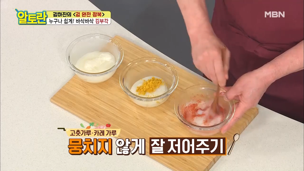 ▶고춧가루와 카레 가루가 몽치지 않게 잘 저어 섞어 줍니다.