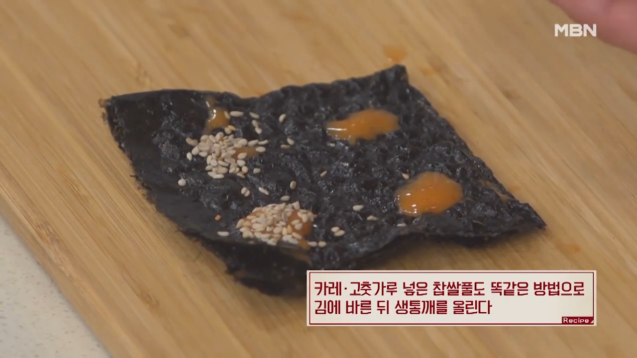 ▶카레, 고춧가루 넣은 찹쌀풀도 마찬가지 방법으로 김에 바른 뒤 생통깨를 올려 줍니다.