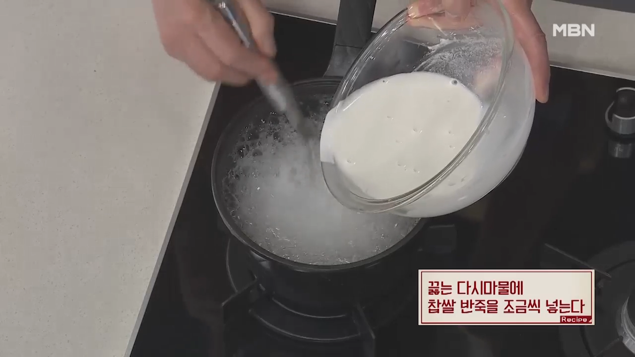 ▶끓는 다시마물에 찹쌀 반죽을 조금씩 넣어줍니다.