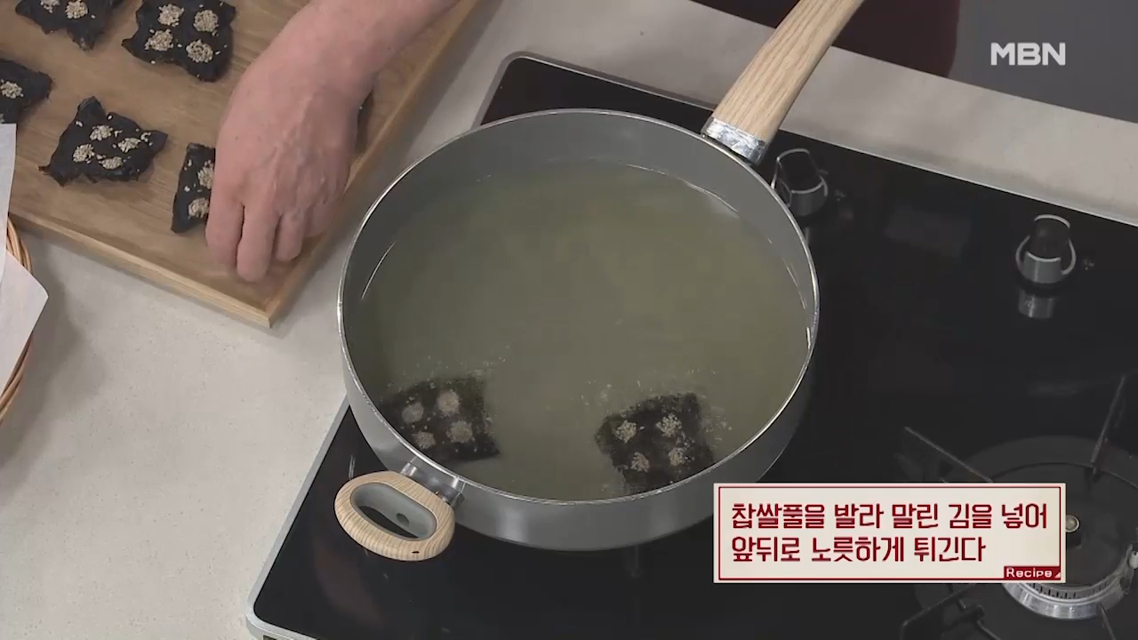 ▶찹쌀풀을 발라 말린 김을 넣어 앞뒤로 노릇하게 튀겨줍니다.