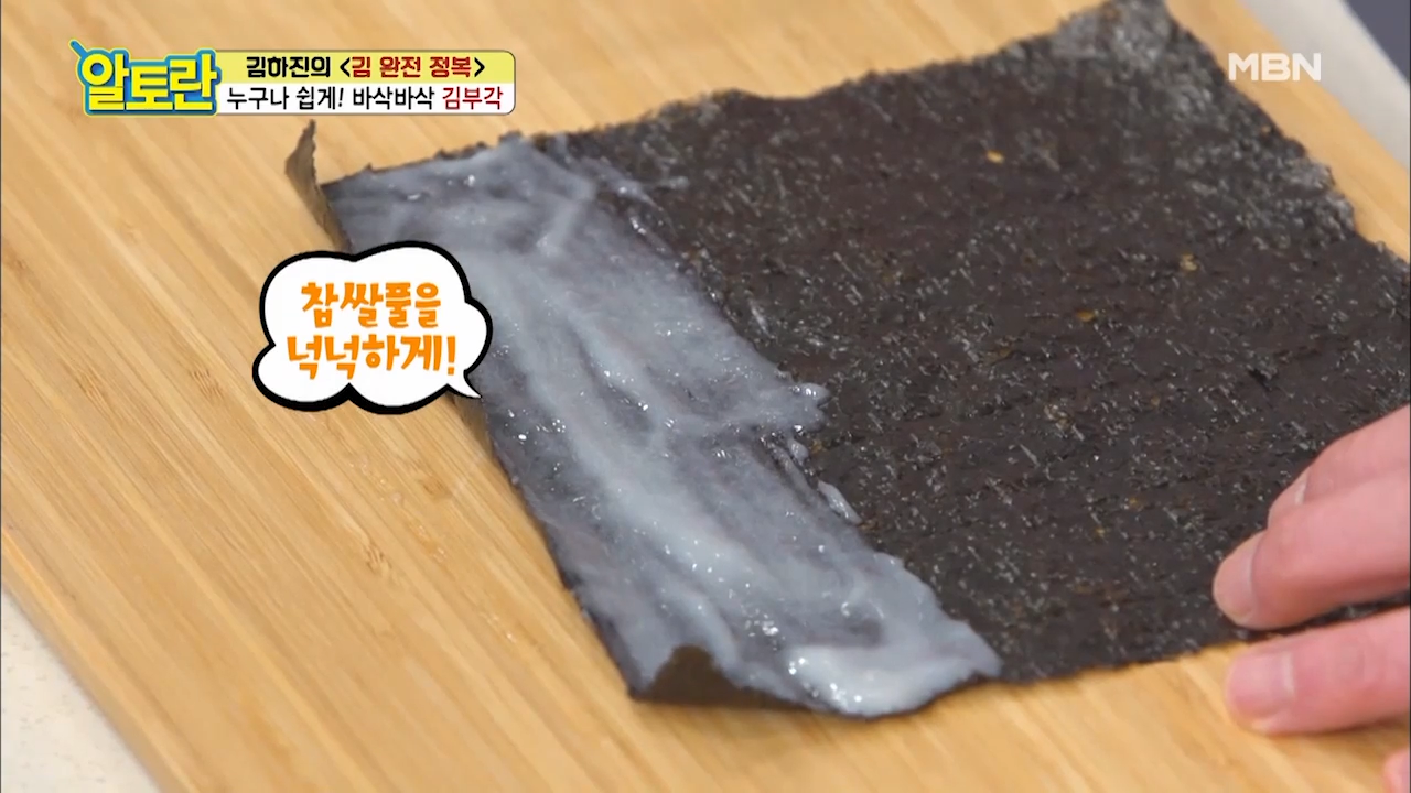 ※김밥용 김에는 거친 면과 매끈한 면이 있으며 찹쌀풀은 김의 거친 면에 발라줍니다.