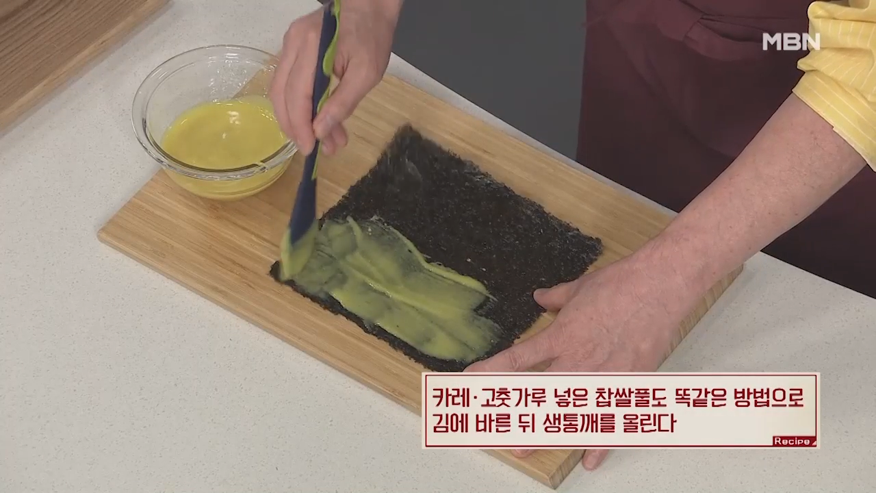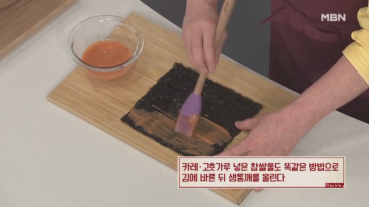 ▶카레, 고춧가루 넣은 찹쌀풀도 마찬가지 방법으로 김에 바른 뒤 생통깨를 올려 줍니다.