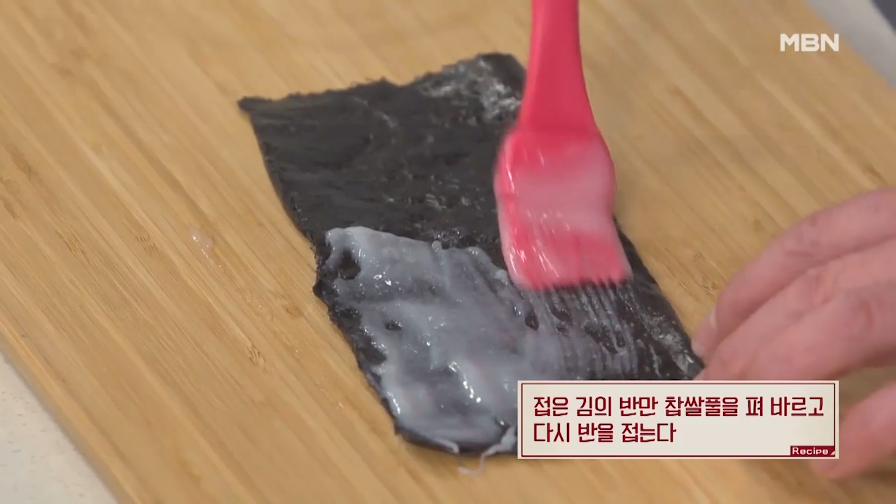 ※중앙에 찹쌀풀을 넉넉히 바른 후 김을 접어 눌러주면 골고루 찹쌀풀이 묻게 됩니다.
