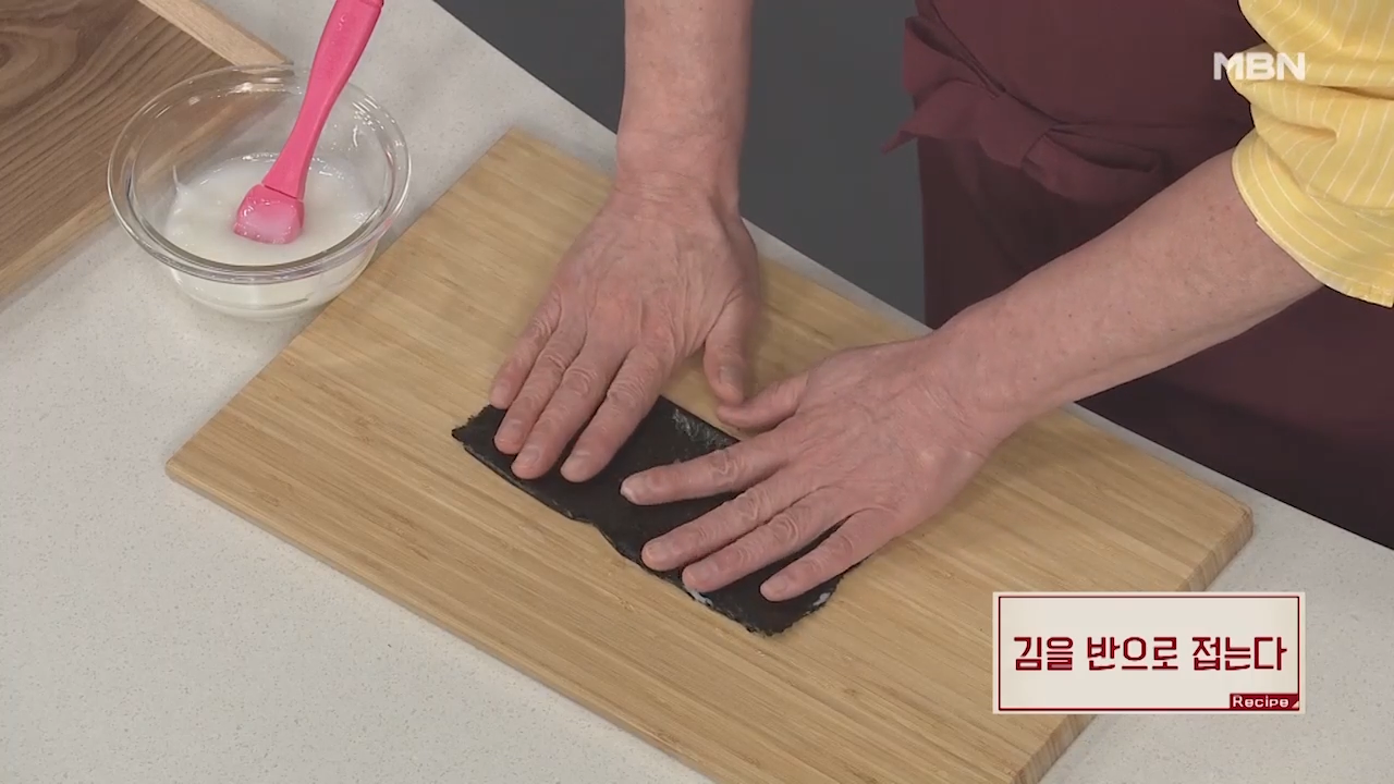 ▶가위로 자르면 지저분한 부스러기가 발생하기 대문에 자르지 않고 찹쌀풀을 이용해 김을 접어 사용합니다.