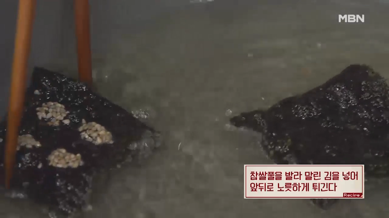 ▶찹쌀풀을 발라 말린 김을 넣어 앞뒤로 노릇하게 튀겨줍니다.