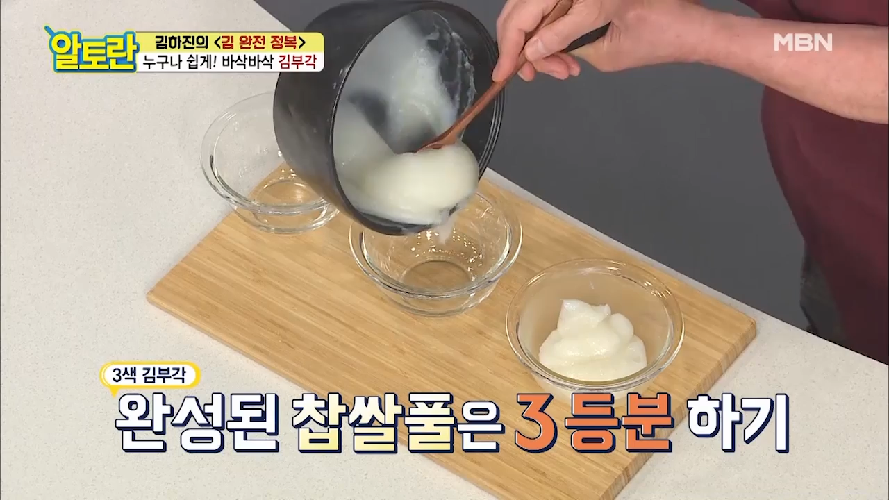 ▶3색 김부각을 만들기 위해 완성된 찹쌀풀을 3등 분해 담아줍니다.