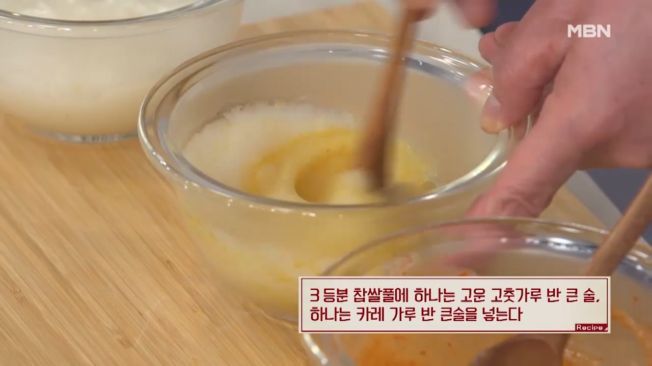▶3 등분 한 찹쌀풀 중 하나에 고운 고춧가루 반 큰 술을 넣어줍니다.