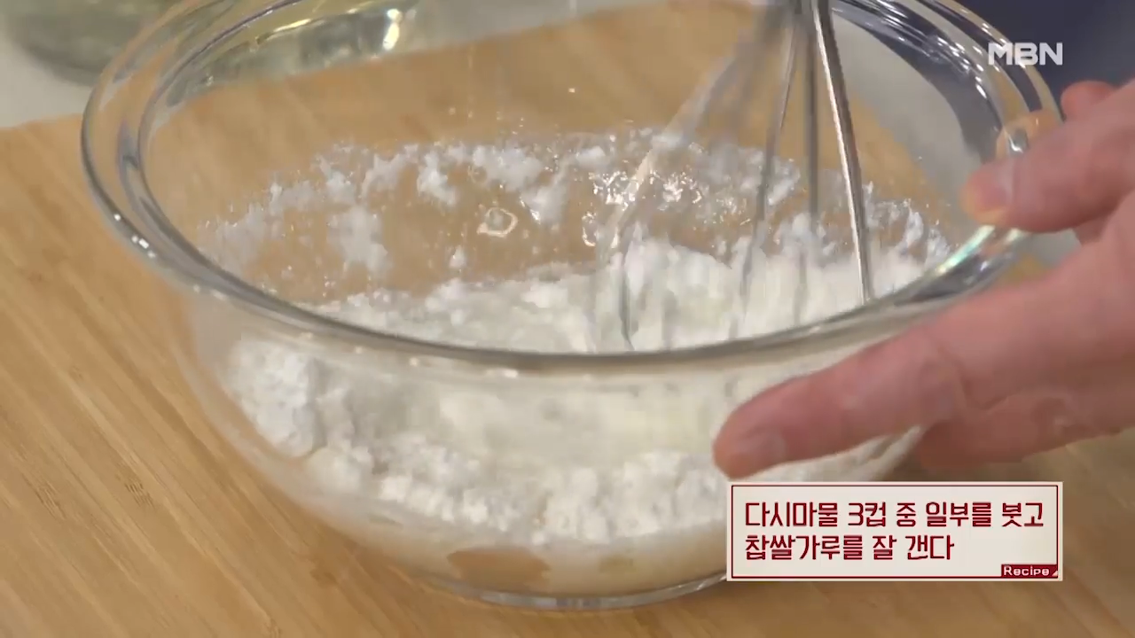▶다시마물 3컵 중 일부를 붓고 찹쌀가루를 잘게 개어줍니다.