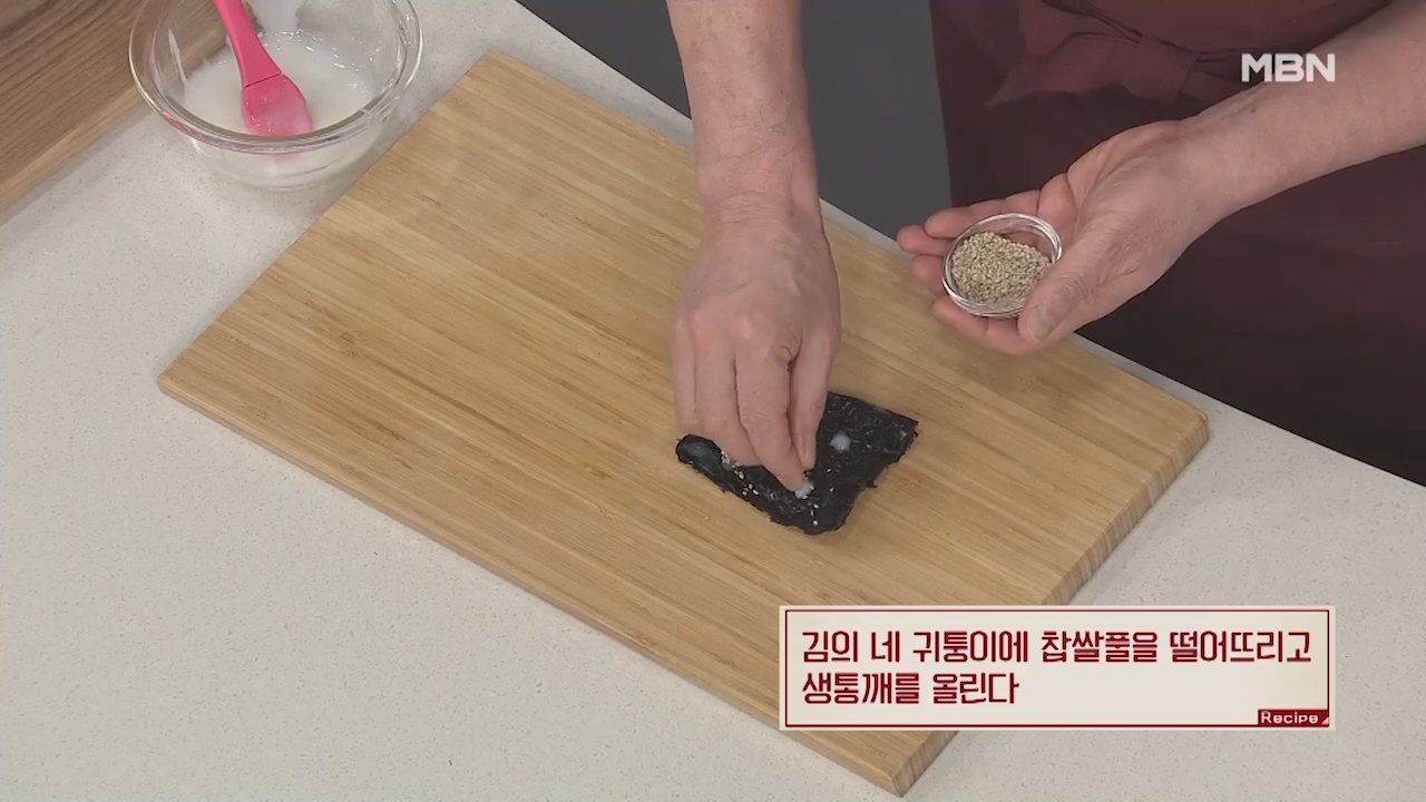 ▶김의 네 귀퉁이에 찹쌀풀을 조금씩 떨어뜨려 줍니다.