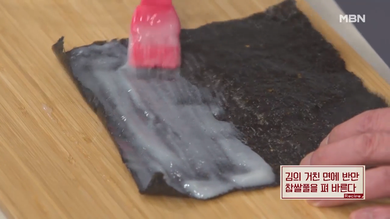 ▶김의 거친 면에 반만 찹쌀풀을 펴 발라줍니다.