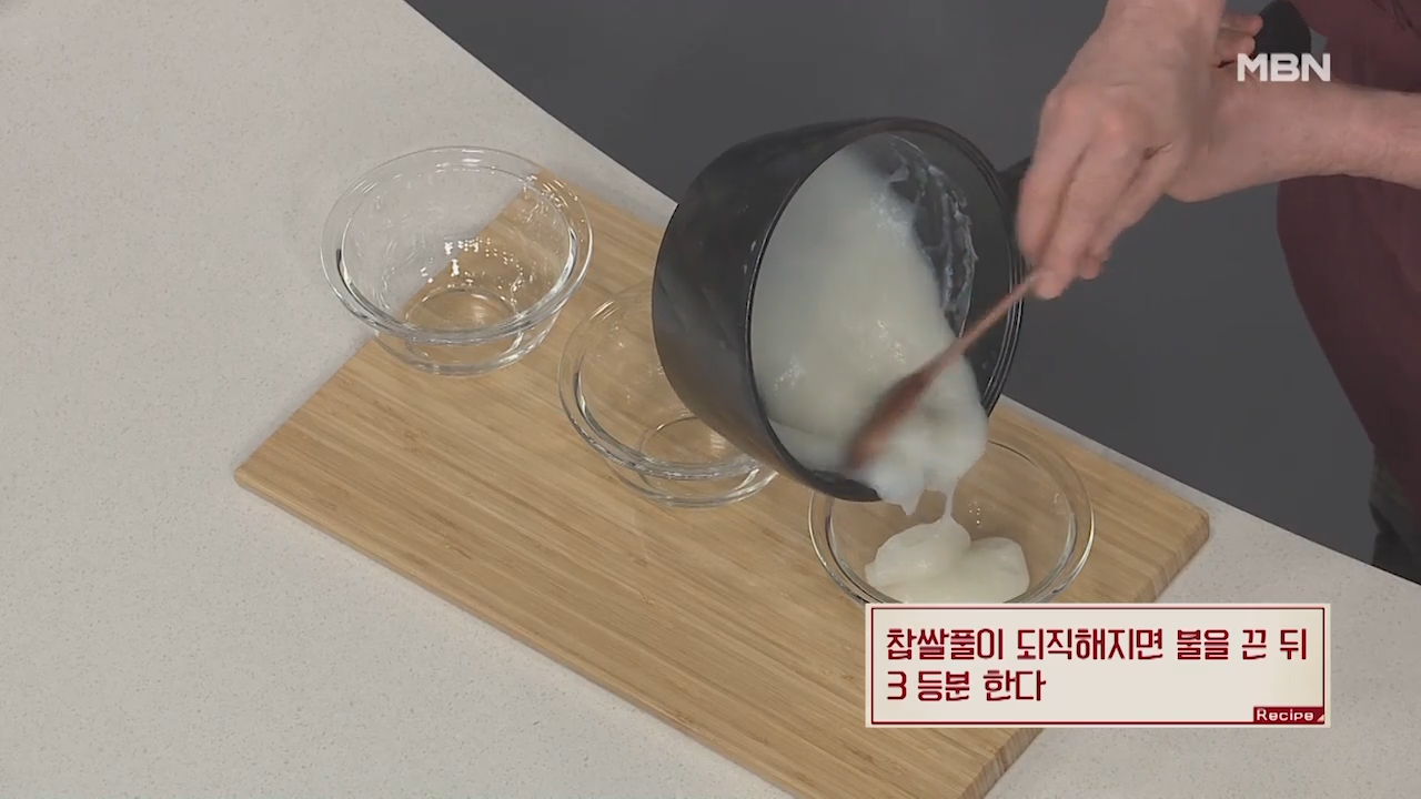 ▶찹쌀풀이 되직해지면 불을 꺼줍니다.